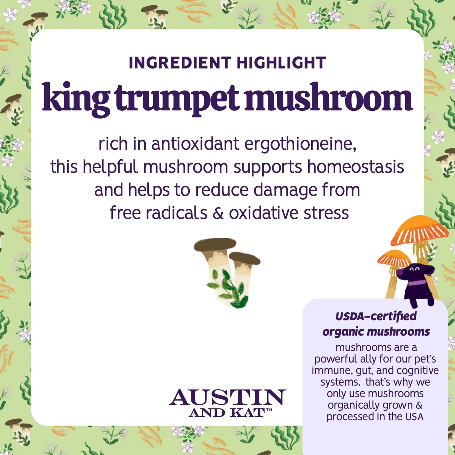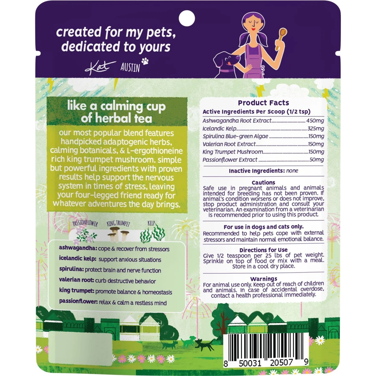 - A soothing blend of mushroom and botanical adaptogens help support your pet in the face of everyday stressors like the mailman and thunderstorms.