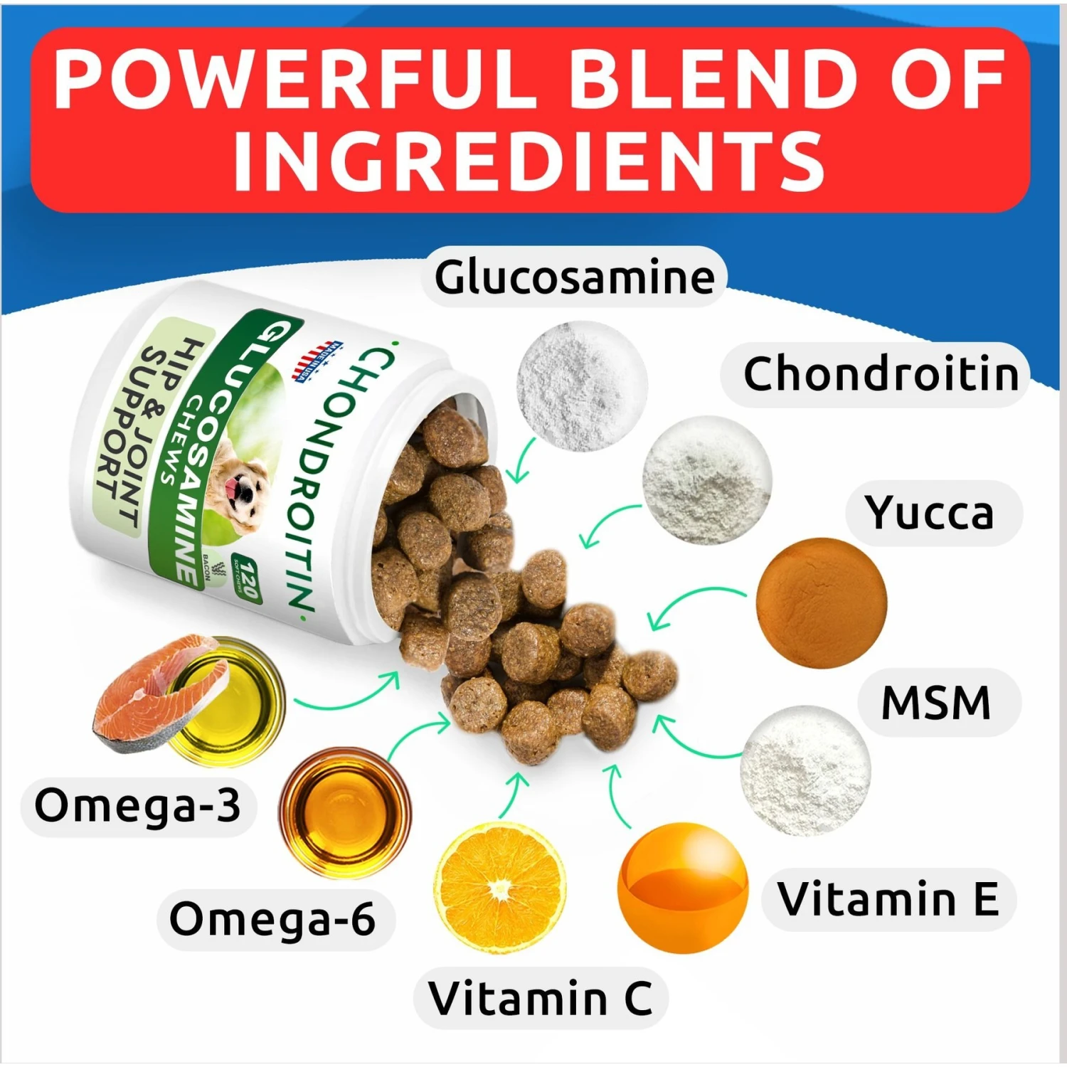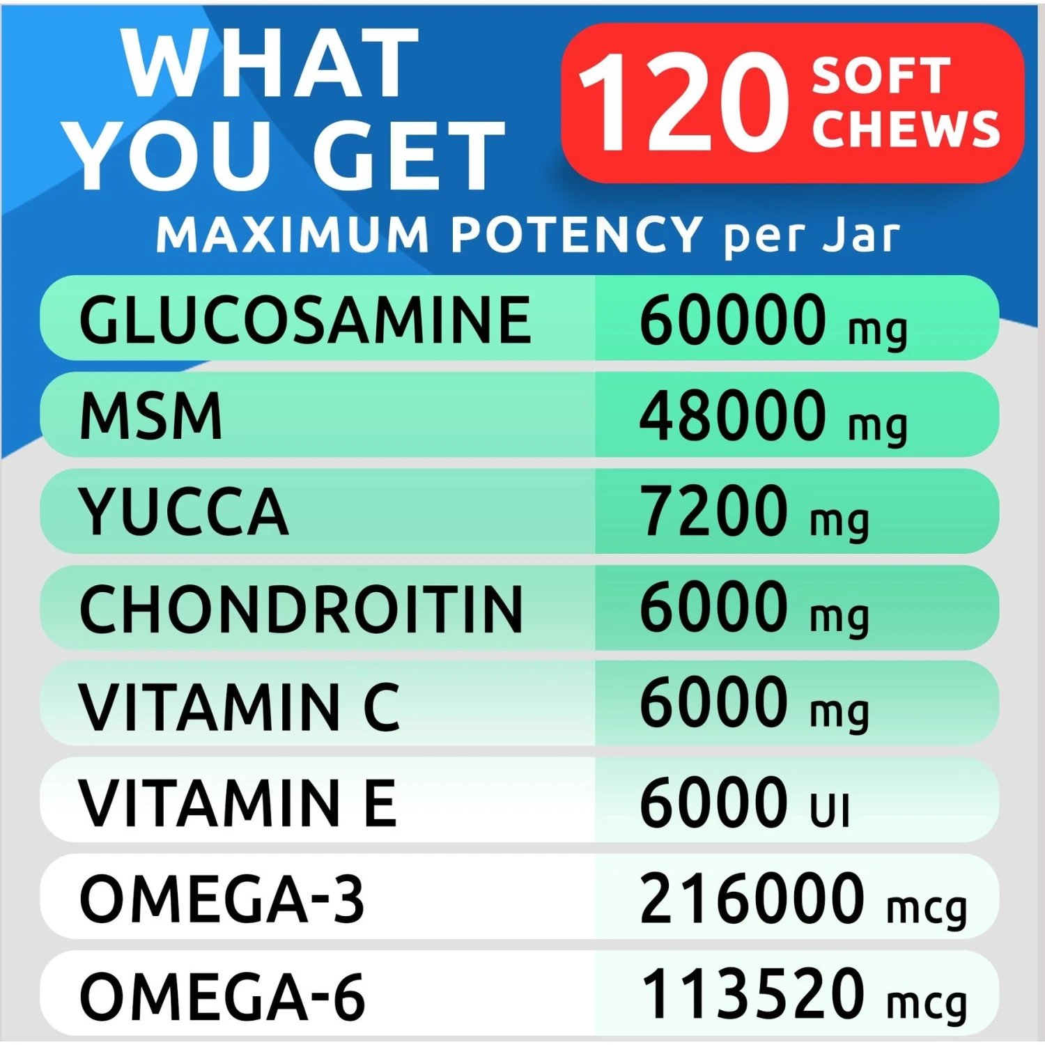 - The comprehensive blend of glucosamine, chondroitin, MSM, yucca, and omega fatty acids works to alleviate the pain and discomfort caused by aging, inflammation, and hip dysplasia.