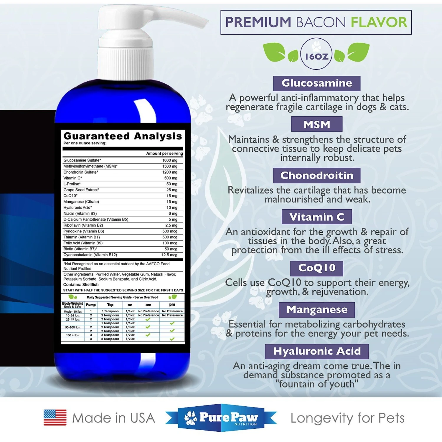 - Made in the USA with an irresistible bacon flavor that will make dogs ecstatic to take their daily supplement.