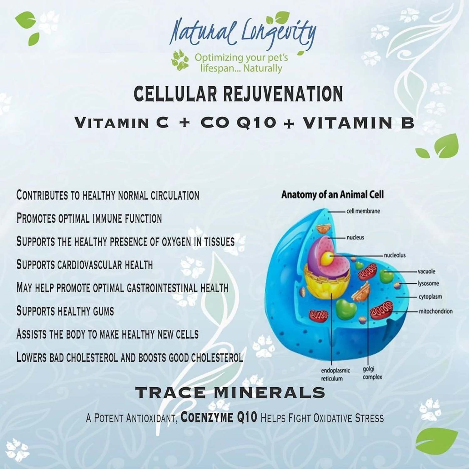 - Vitamin C, CoQ10, manganese and hyaluronic acid work as a fountain of youth to support energy and protect the body from stress.