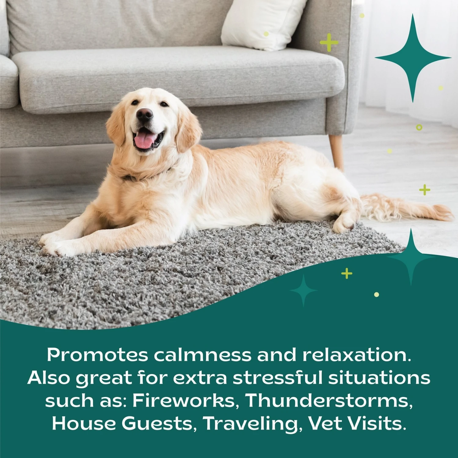 - Helps dogs of all ages cope with everyday stress and helps reduce stress-related behaviors by promoting relaxation and calmness.