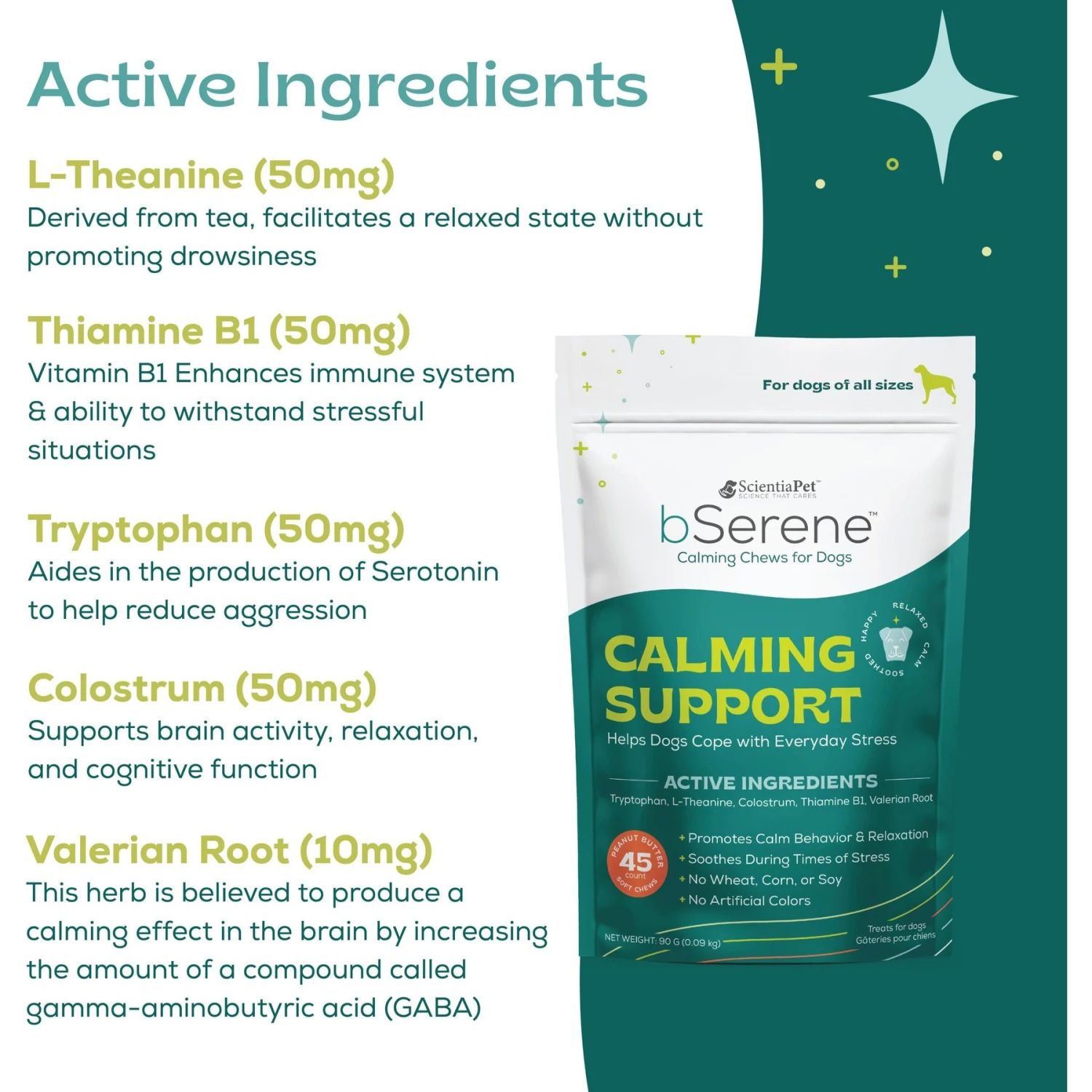 - Contains quality ingredients, including L-theanine and thiamine B1, tryptophan, colostrum and valerian root to promote relaxation and give your buddy a boost of good vibes!