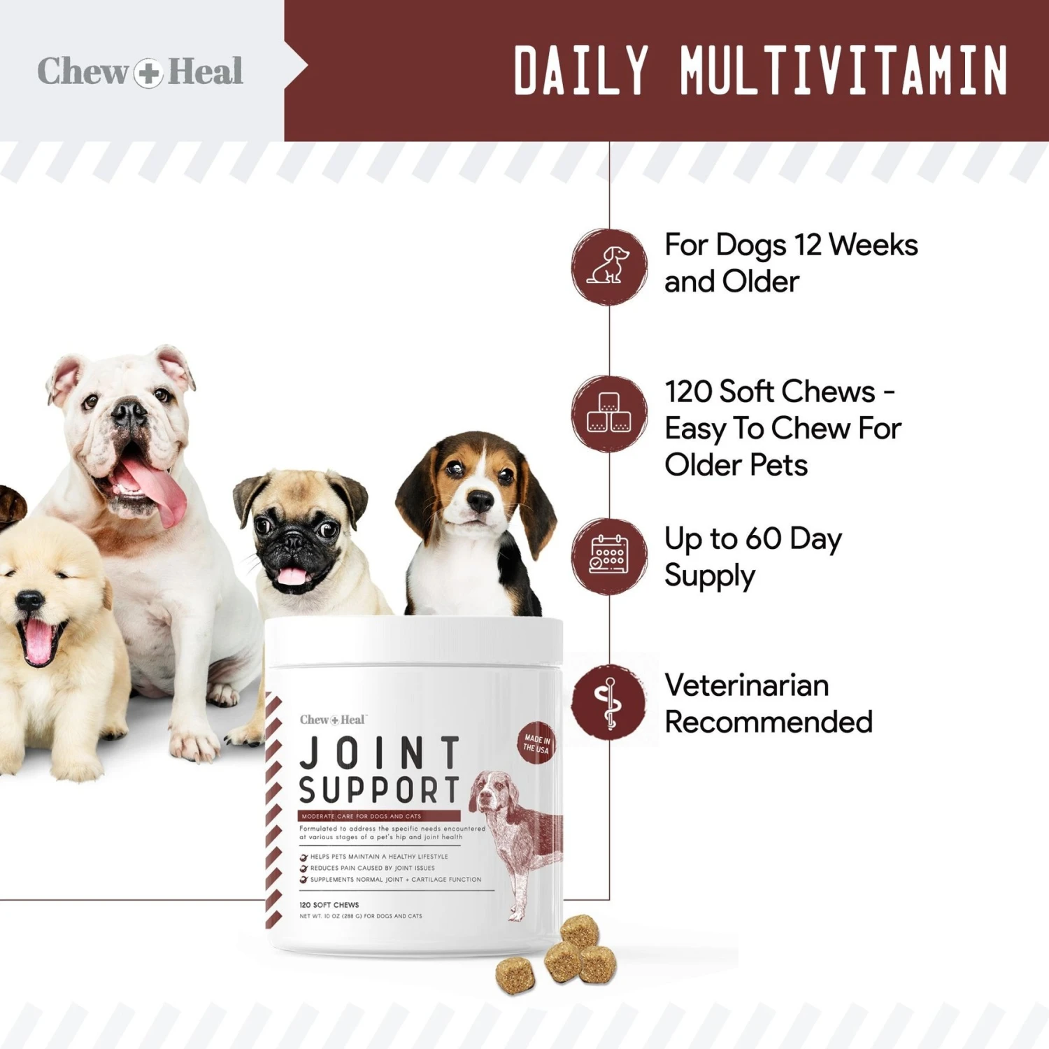 - Daily multivitamin is formulated with glucosamine and chondroitin to help support your BFF’s joint, hip, bone, muscle and cartilage health.