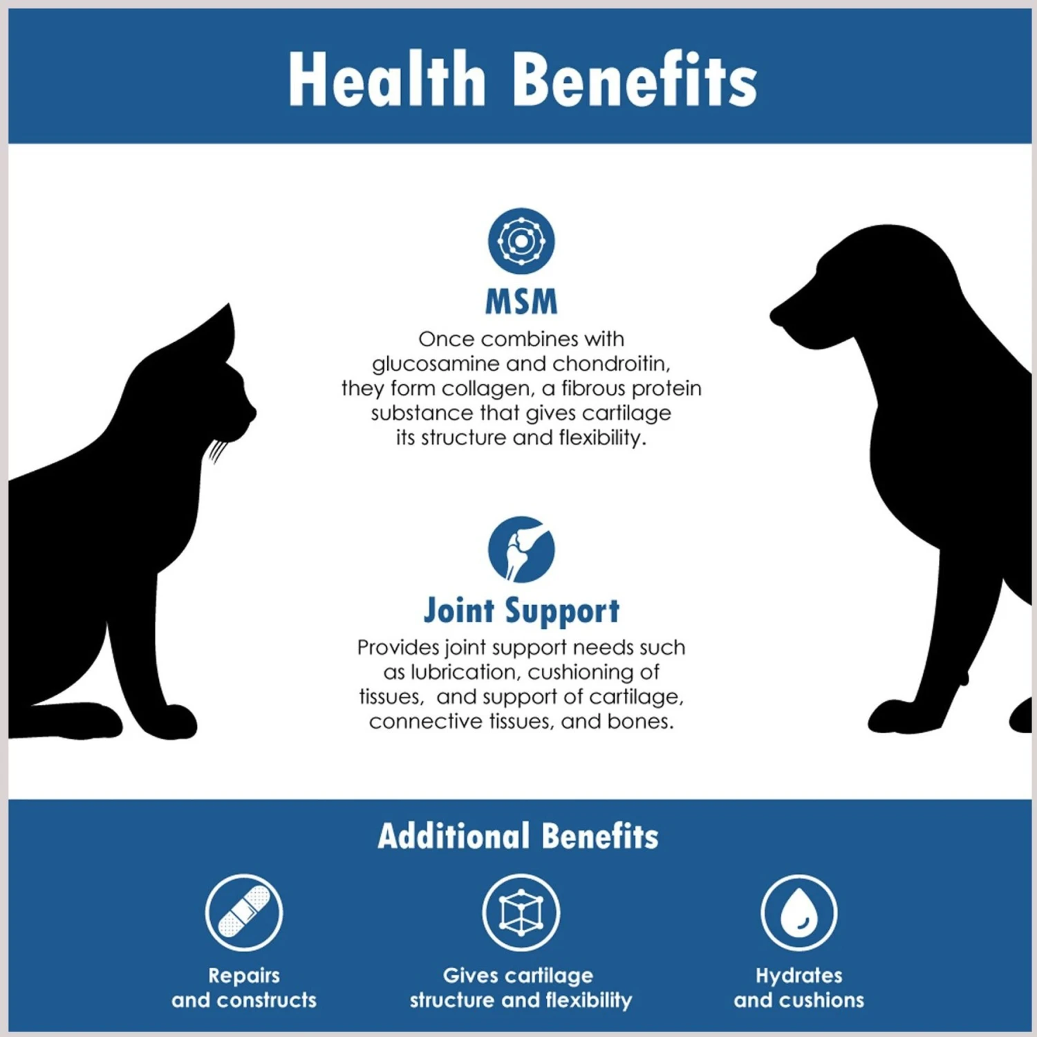- Helps keep your pet’s joints and connective tissues resilient, lubricated and mobile, while helping cartilage absorb water to keep it hydrated and cushioned.