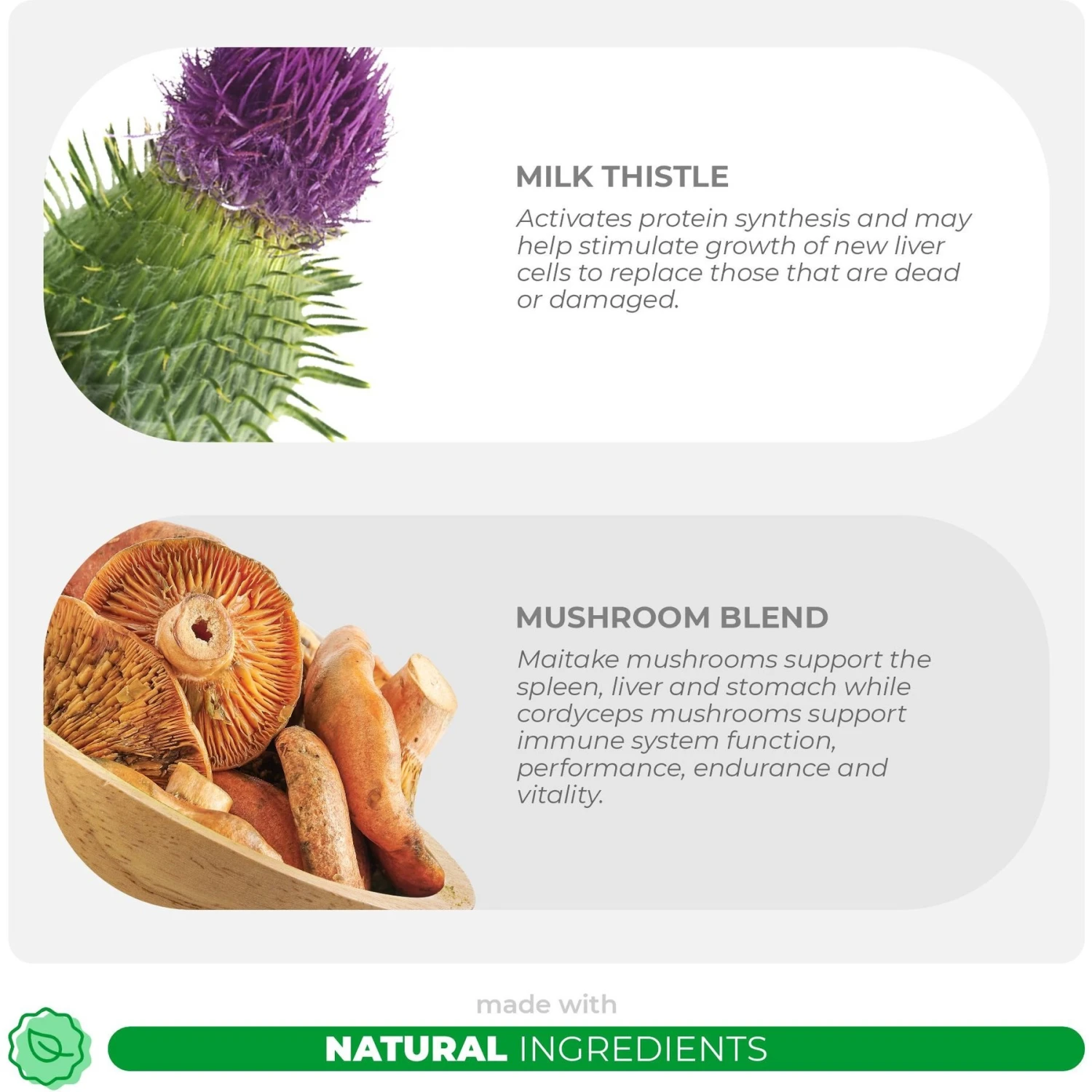 - Reishi mushrooms support hip and joint health, and milk thistle supports liver health.