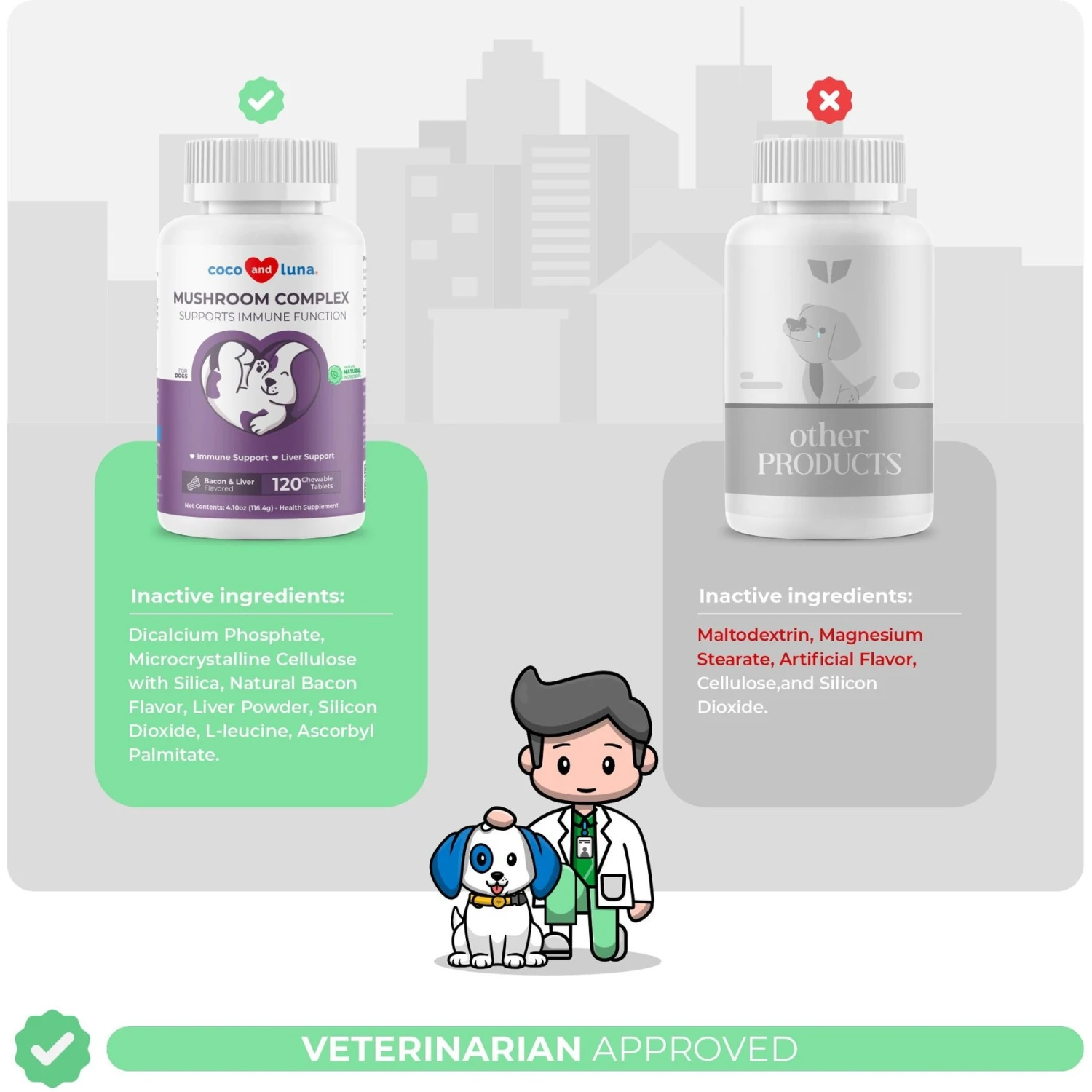 Coco And Luna Mushroom Complex Immune System Support Bacon & Liver Flavor Chewable Tablets Dog Supplement, 120 Count