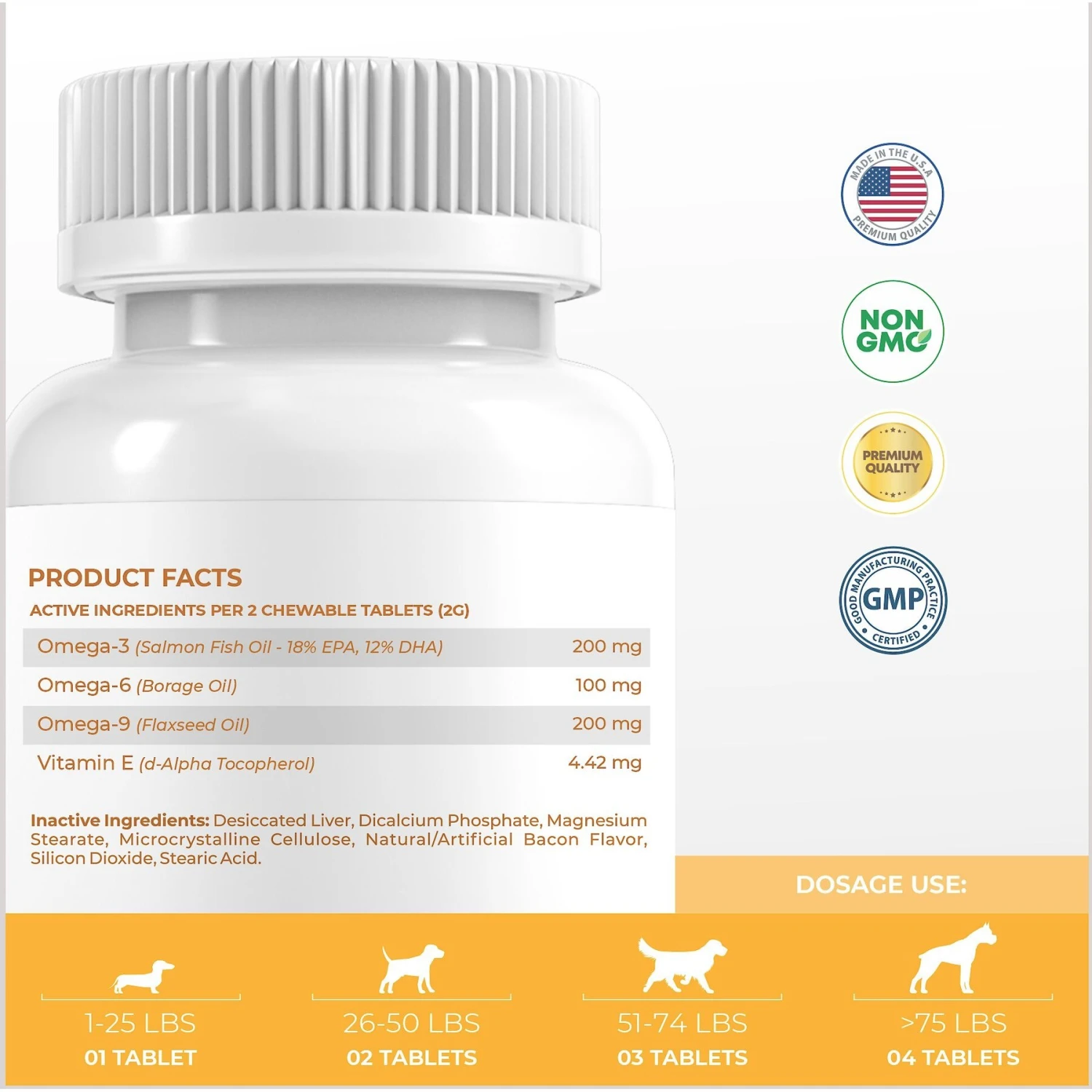 - Supplies 200 mg Omega 3, 100 mg Omega 6 and 200 mg of Omega 9, plus 6.6 IU of Vitamin E for vigorous skin and immune support.