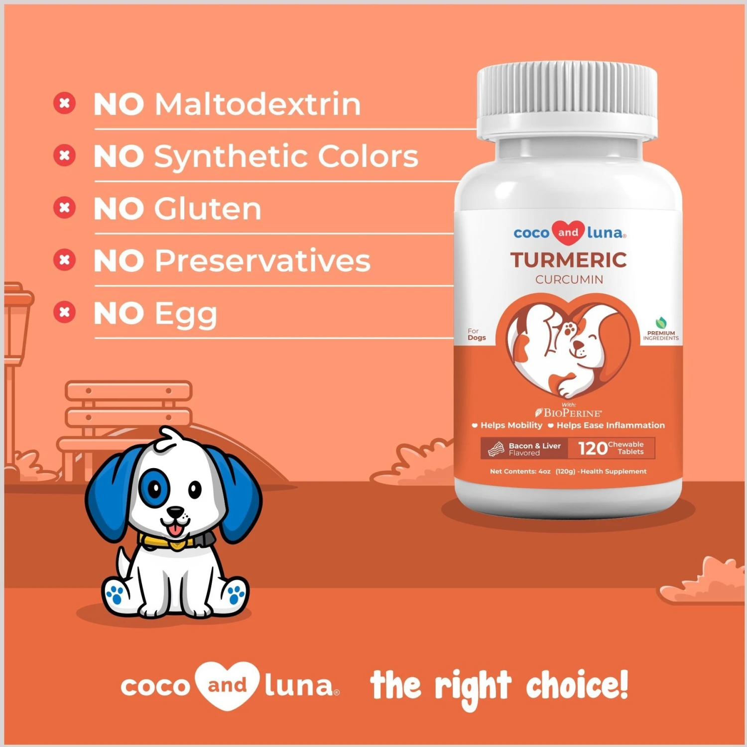 Coco And Luna Turmeric Curcumin Anti-Inflammatory Bacon & Liver Flavor Dog Supplement, 120 Count