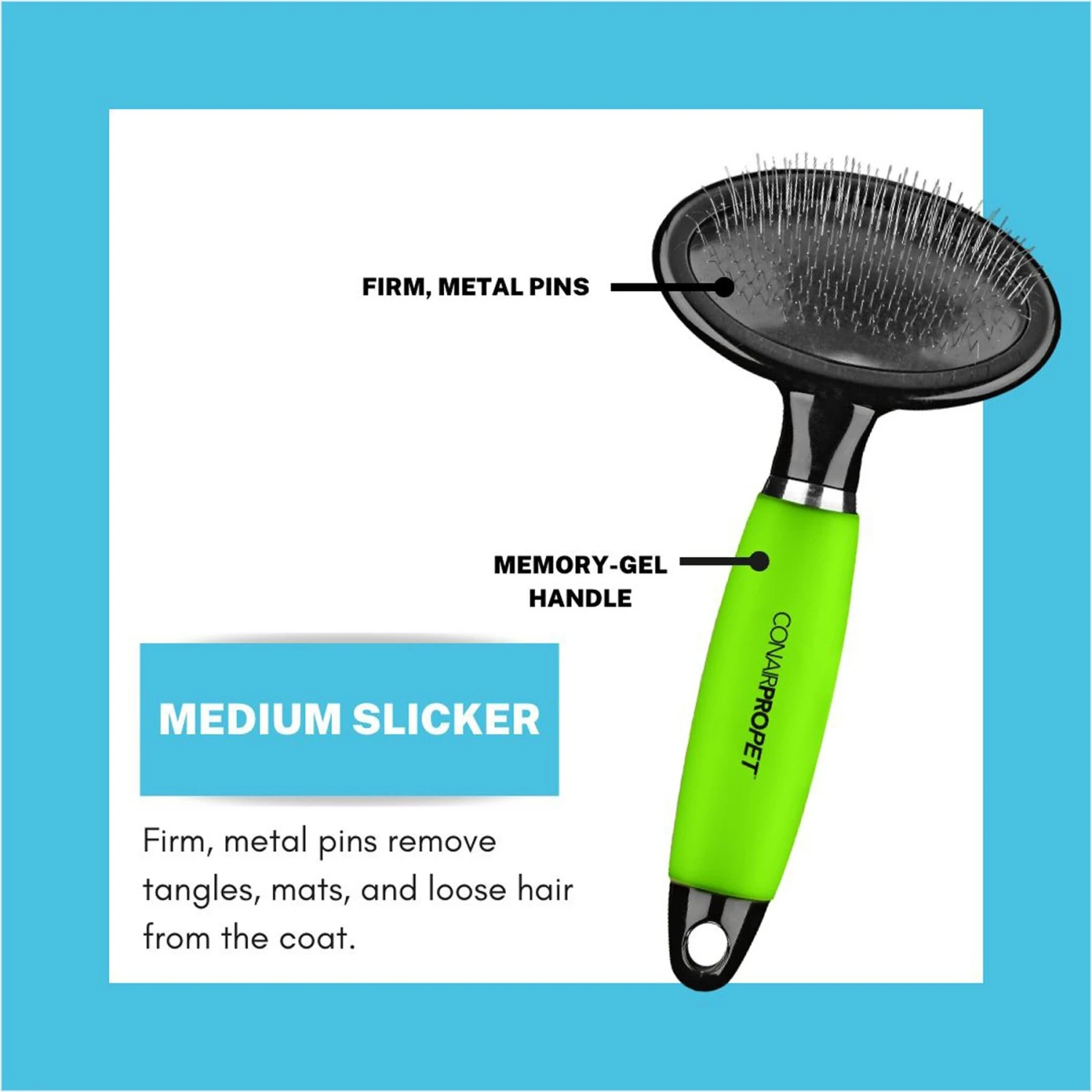 - Made with firm, metal pins, the Slicker Brush removes mats, tangles and loose hair from the coat.
