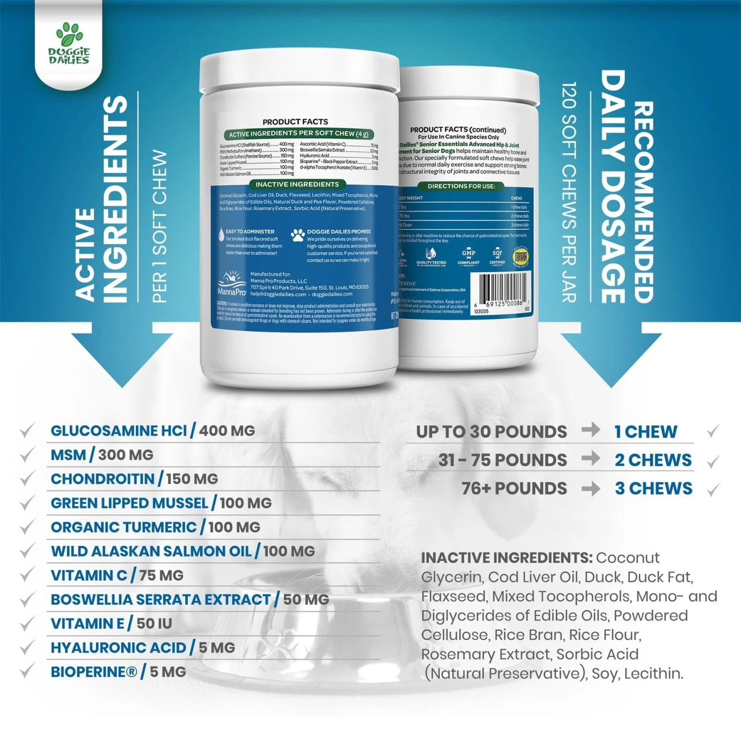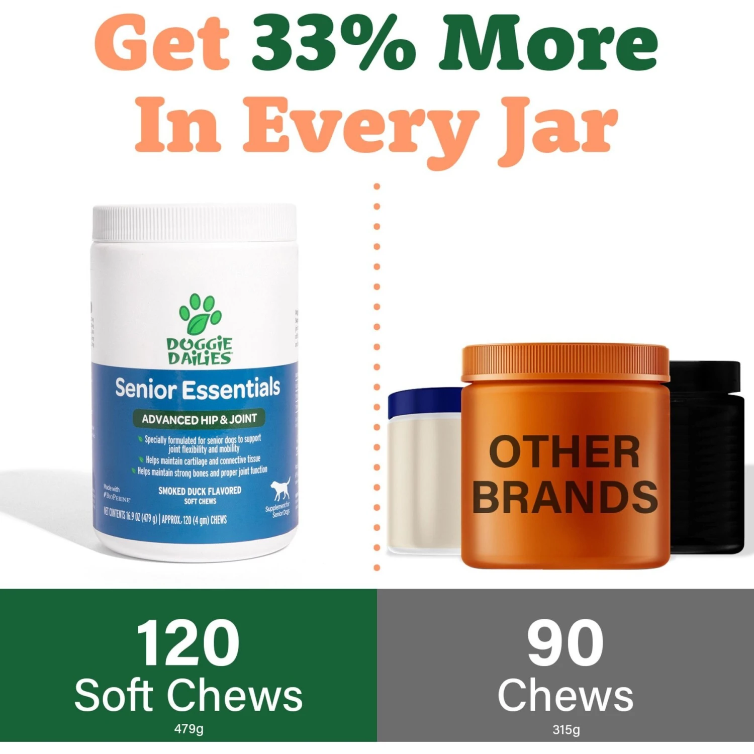 Doggie Dailies Advanced Smoked Duck Flavored Soft Chew Hip & Joint Supplement For Senior Dogs, 120 Count