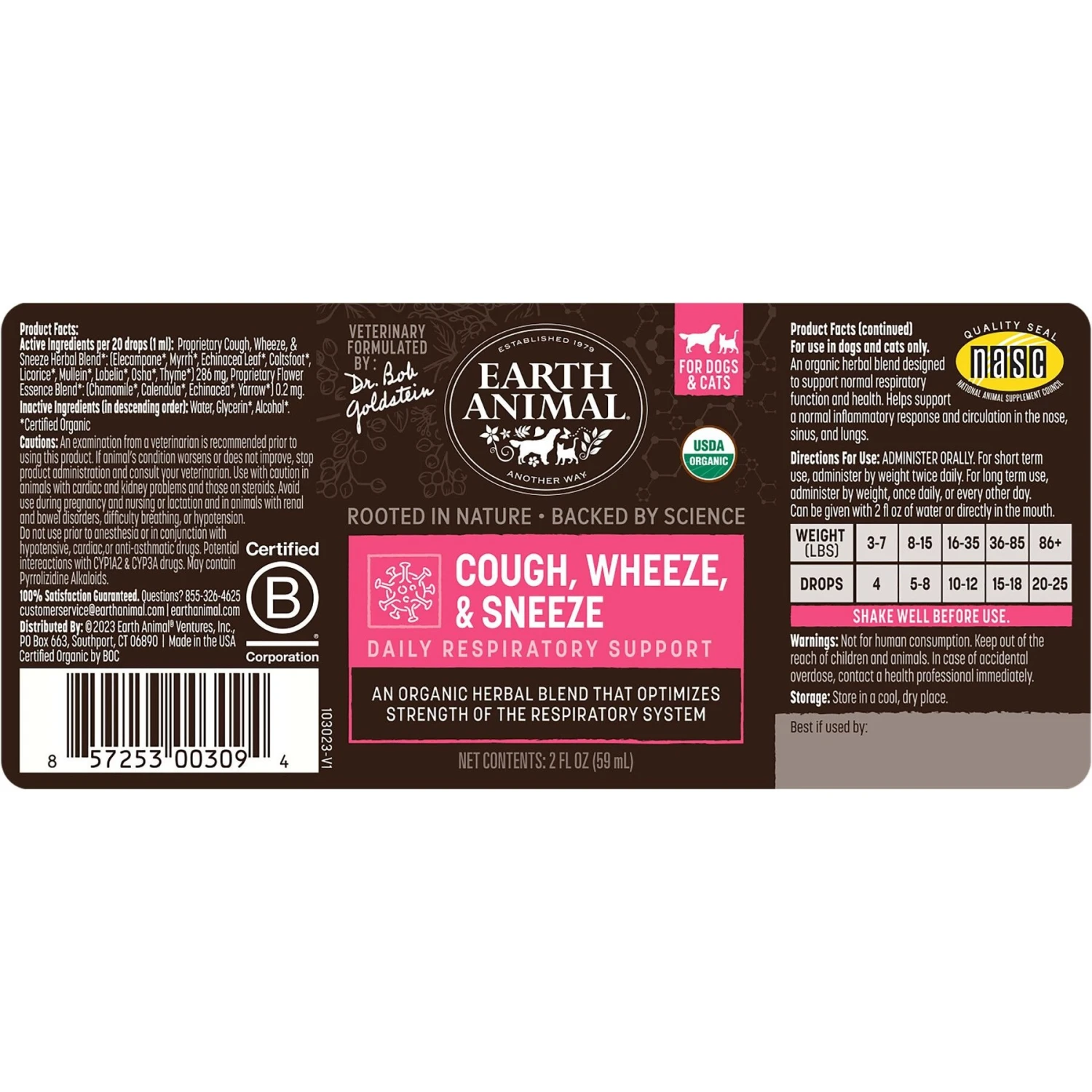 Earth Animal Natural Remedies Cough, Wheeze & Sneeze Liquid Homeopathic Respiratory Supplement For Dogs & Cats, 2-oz Bottle