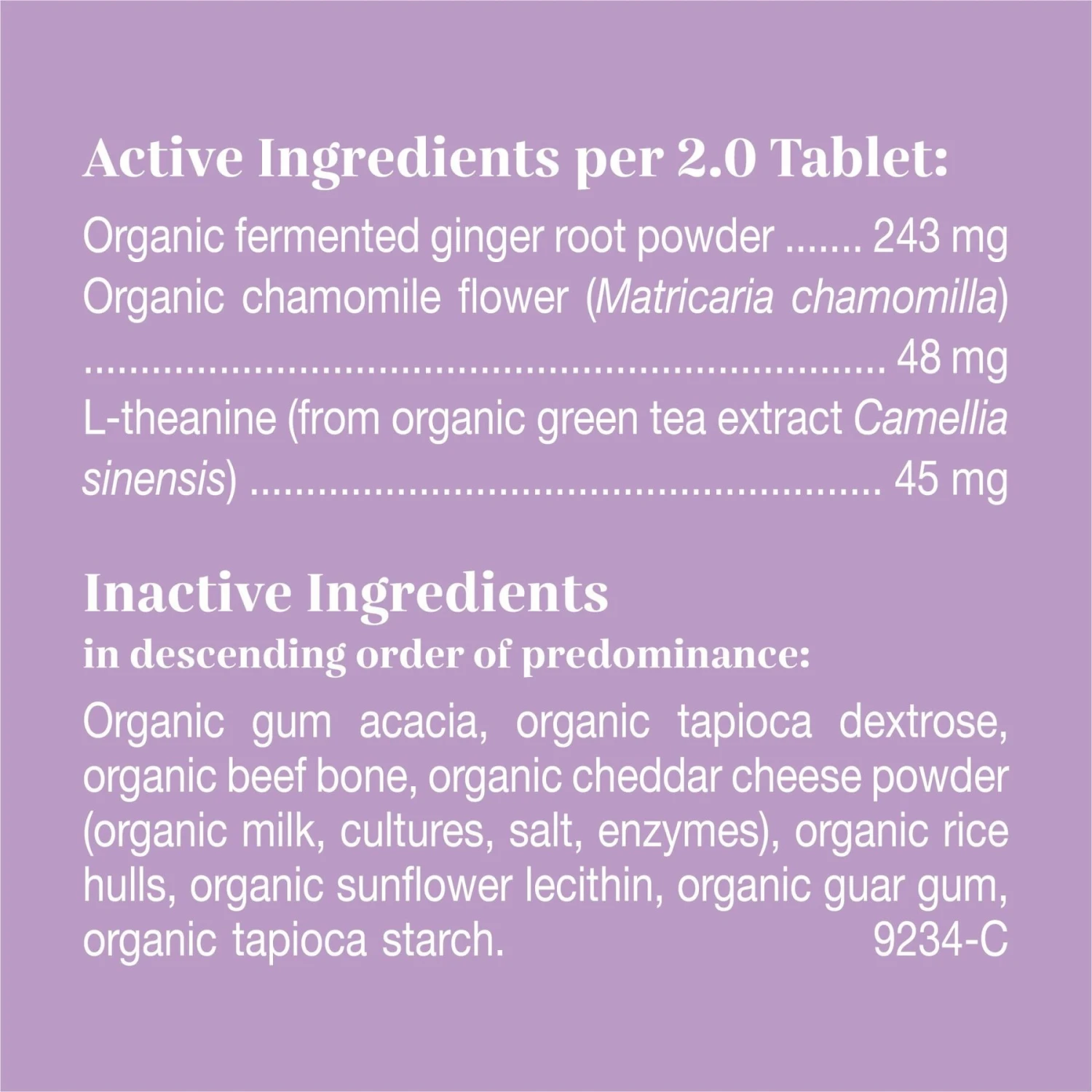 - Made with organic ingredients like chamomile and L-theanine from green tea extract—no artificial colors, flavors or preservatives.