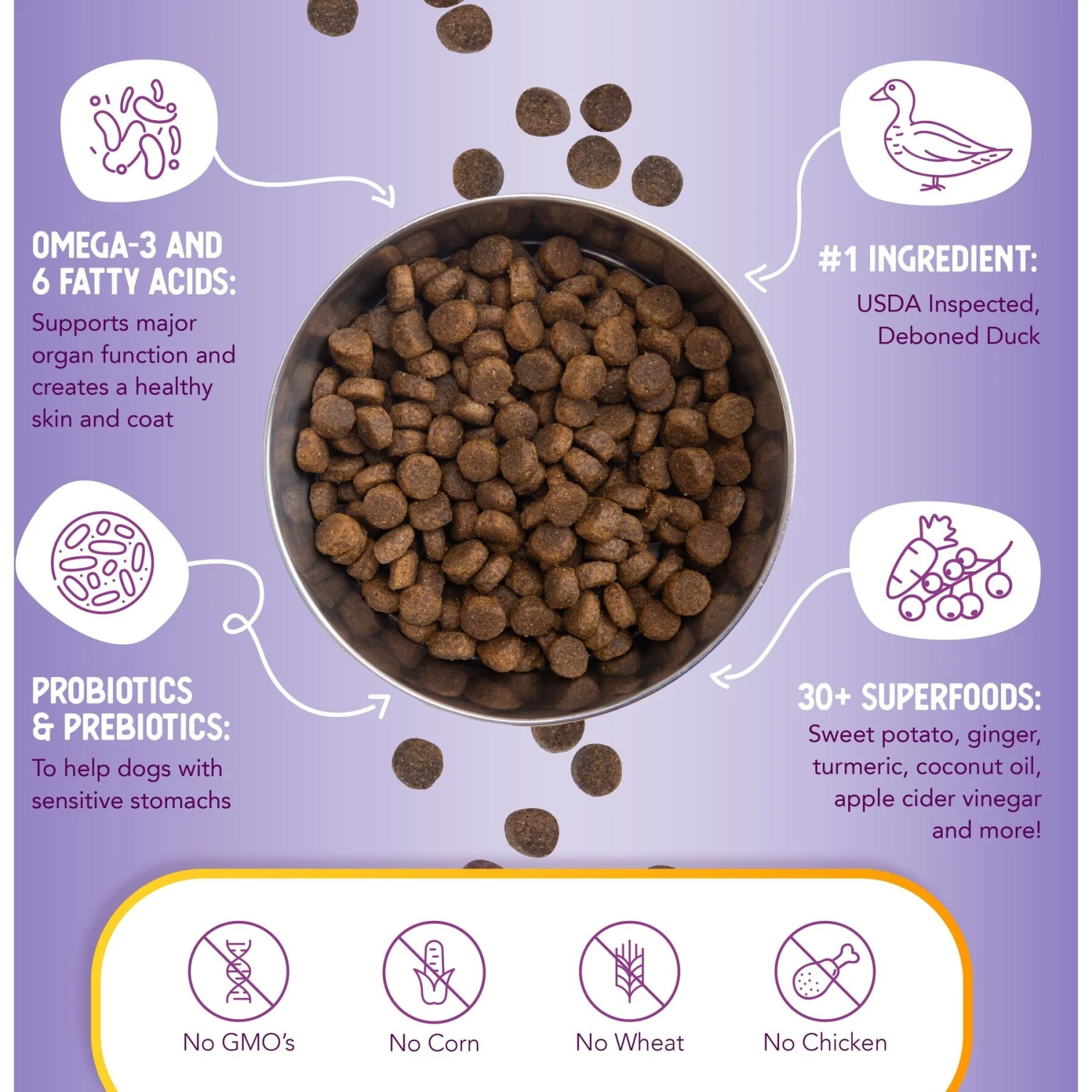 - Sourced and Made in the USA. Made with high-quality, duck as the first ingredient, an excellent source of highly digestible alternative proteins with high levels of essential amino acids.