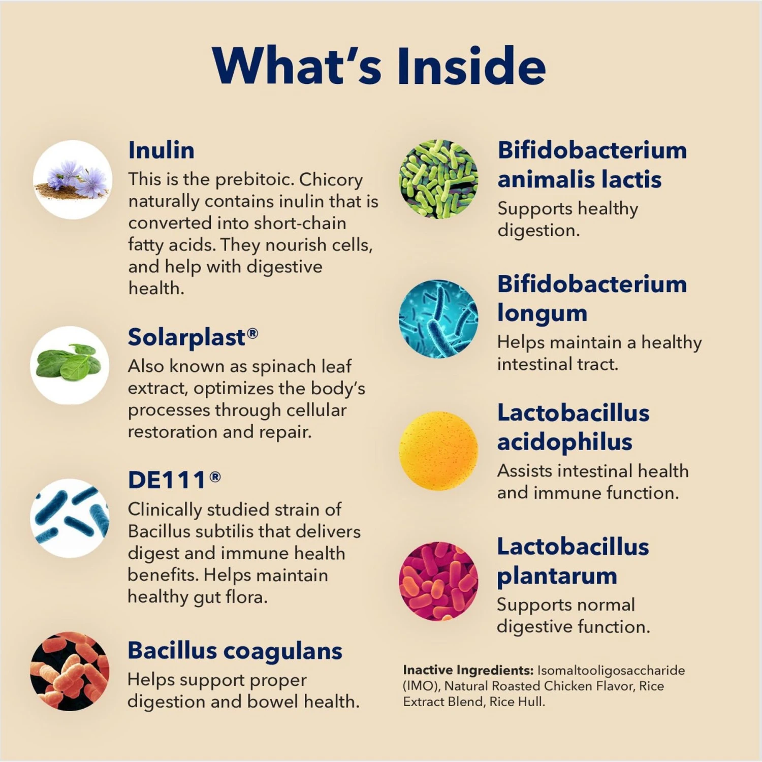 - Designed to reduce negative digestive symptoms, such as diarrhea, appetite loss, constipation, bad breath, gas, and more.
