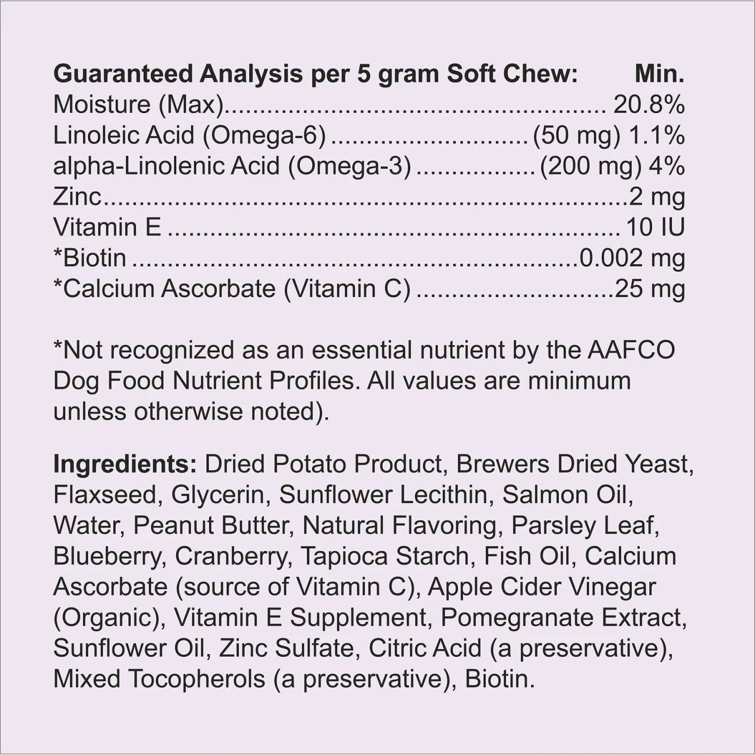 - Each soft chew is made with salmon oil and includes a combination of omega-3 and omega-6 fatty acids, EPA, DHA, zinc, vitamin E and biotin to support skin and coat health.
