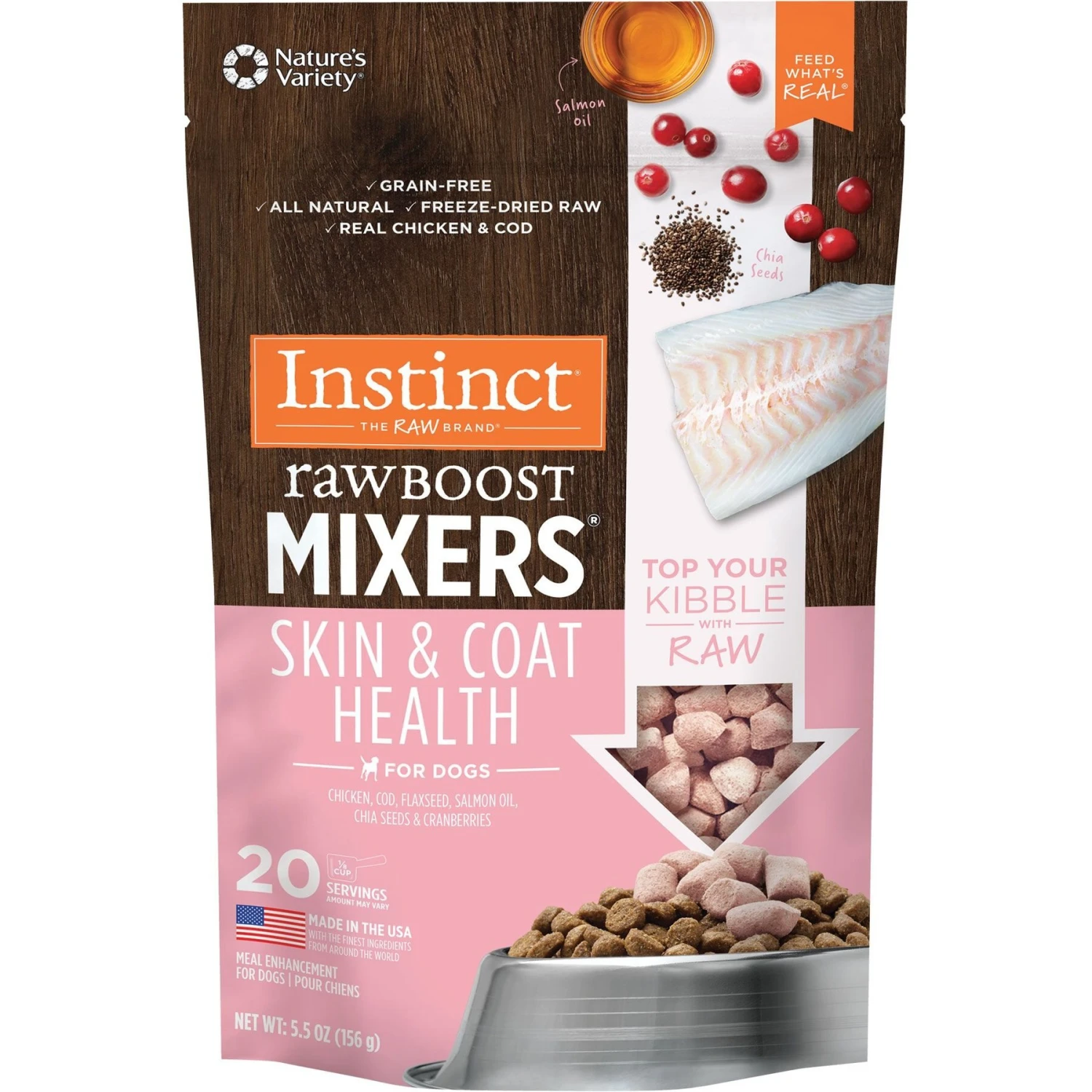 Instinct Freeze-Dried Raw Boost Mixers Grain-Free Skin & Coat Health Recipe Dog Food Topper, 5.5-oz bag—Top your BFF’s kibble with Instinct Freeze-Dried Raw Boost Mixers Grain-Free Skin & Coat Health Recipe Dog Food Topper! This dog food topper is made in the USA and contains natural omega-3 and omega-6 fatty acids from real freeze-dried chicken, cod, salmon oil, chia seeds and cranberries to help encourage healthy skin and a shiny coat. The freeze-drying process helps preserve the raw nutrients your dog needs and the delicious flavor he craves. Not only is this food topper completely grain-free, but it’s also made without corn, wheat, soy, potato, artificial flavors or preservatives!