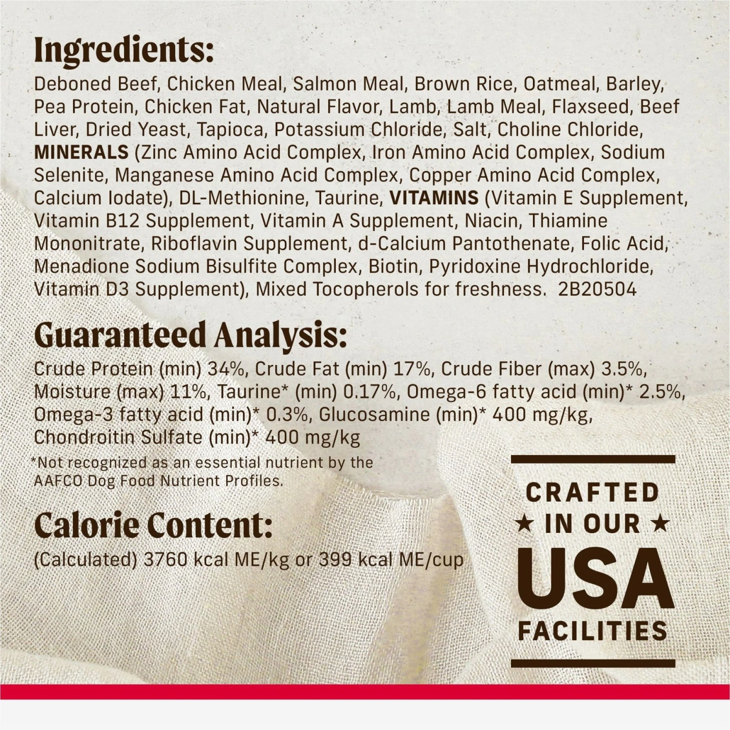 - Real, deboned beef is the first ingredient in this high-protein recipe—there’s also a blend of whole grains like oats to support healthy digestion.