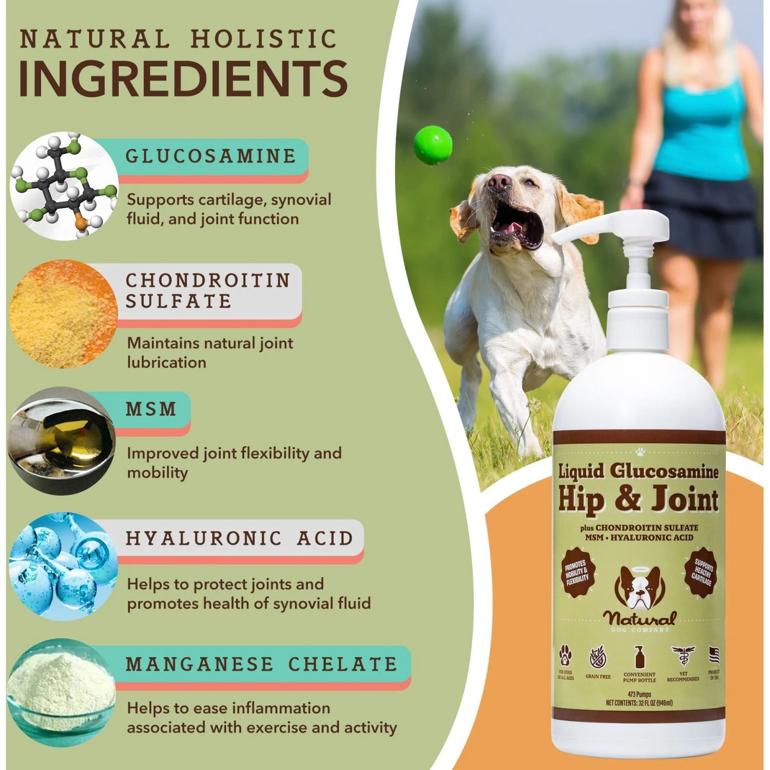 - Created with quality ingredients, including glucosamine HCL, chondroitin sulfate, manganese and hyaluronic acid.