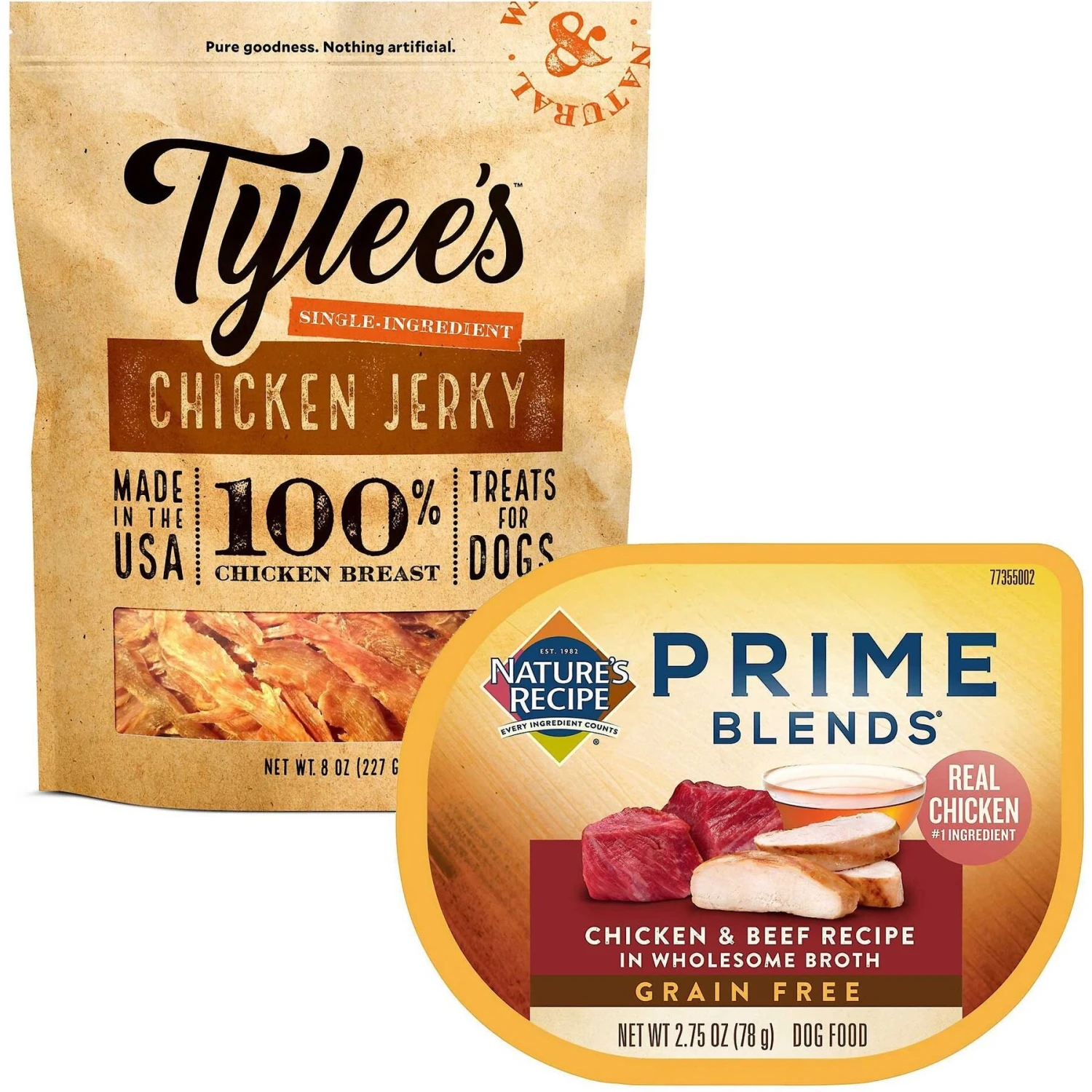 Nature’s Recipe Chicken & Beef Recipe In Savory Broth Grain-Free Wet Dog Food & Tylee’s Chicken Jerky Dog Treats