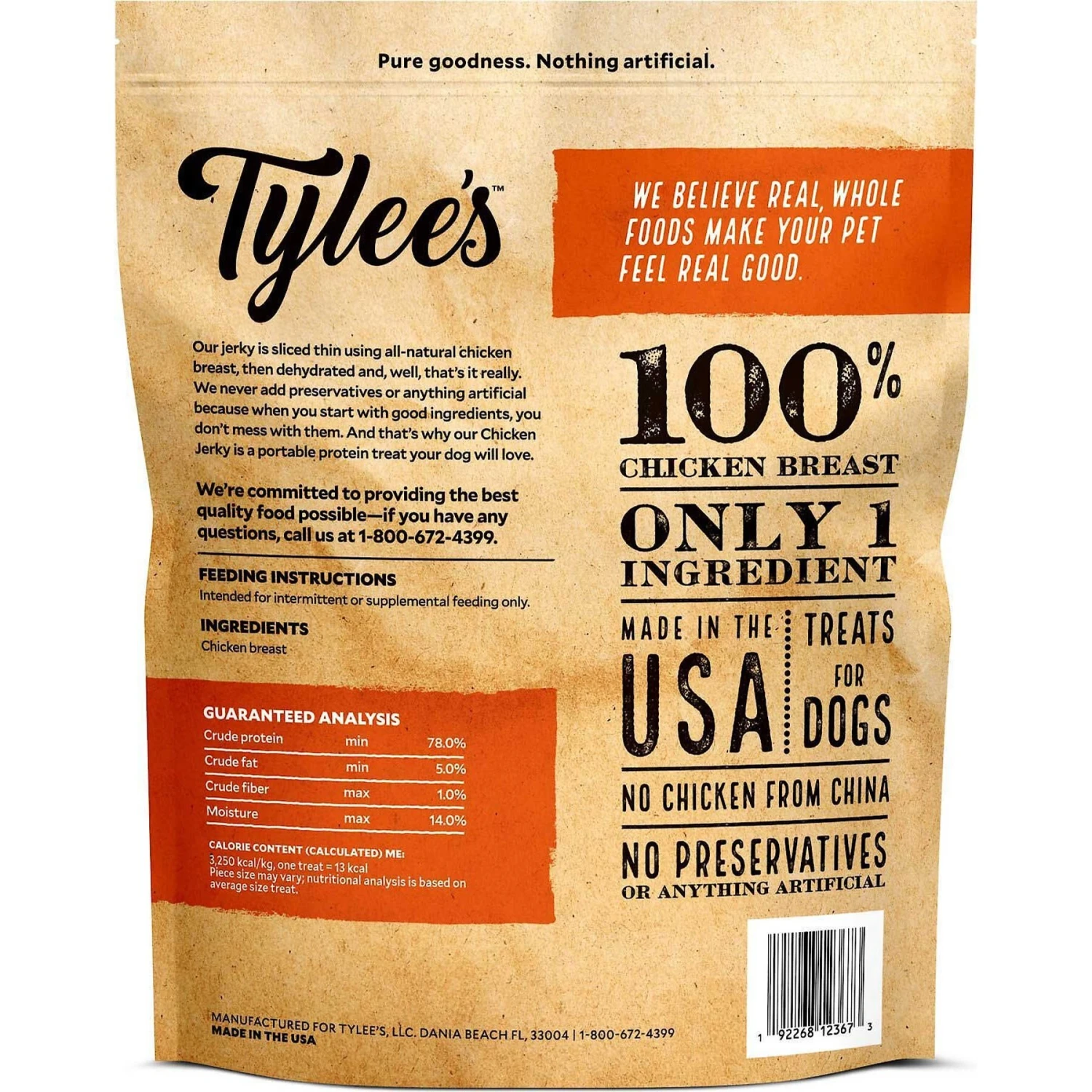 Give your paw-tner a bellyful of benefits! Each purchase comes with Nature’s Recipe Prime Blends Chicken and Beef Recipe Grain-Free Wet Dog Food, 2.75-oz tray, case of 12 & Tylee’s Chicken Jerky Dog Treats, 8-oz bag. of Nature’s Recipe Prime Blends Wet Dog Food. Nature’s Recipe Prime Blends Chicken and Beef Recipe Grain-Free Wet Dog Food is made with real chicken as the very first ingredient, followed by other high-quality ingredients like beef, sweet potatoes, green beans and a flavorful chicken broth. It’s crafted with added vitamins, nutrients, minerals and active antioxidants to provide your pup with wholesome nutrition in every bite. And with sensitive sidekicks in mind, it’s made with zero poultry by-product meal, corn, wheat, soy, or artificial flavors, colors and preservatives. Tylee’s Chicken Jerky Dog Treats are made with 100% chicken breast—the same quality meat that you would eat. When it comes to dog treat recipes, Tylee’s knows that less is really more. The only ingredient you’ll find listed is pure meat that’s been thinly sliced and dehydrated to create a jerky that’s chewy and irresistible. This delicious snack delivers 76% protein and all the flavor your dog craves. To keep every bite as fresh as the first, Tylee’s lets nature do its work by using a drying process instead of adding chemical preservatives. The result is a portable protein treat that you can take anywhere for spontaneous on-the-go rewards. Break them into bite-size pieces for tinier pups, or to just stretch out treat time.