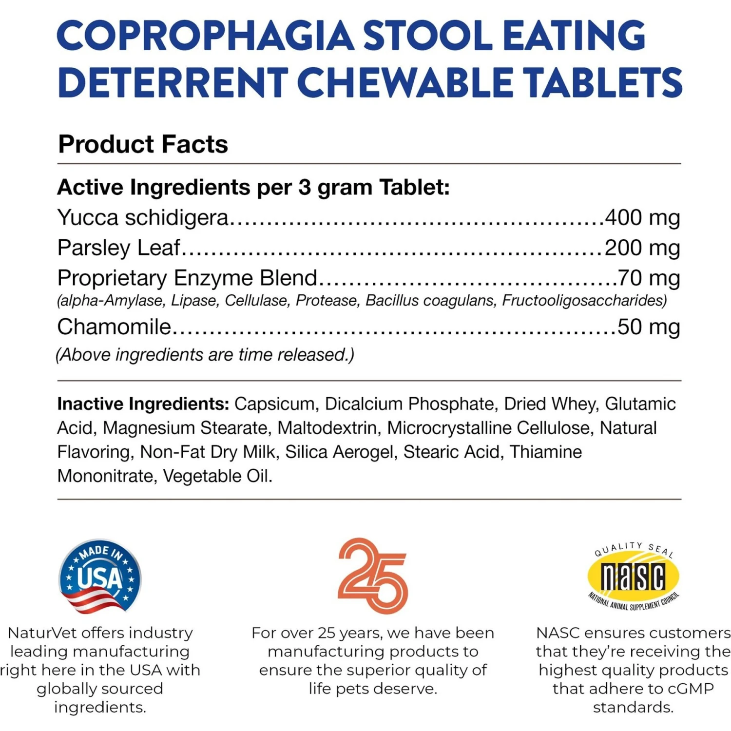 - Special formula blend of yucca, parsley, chamomile and proprietary enzymes helps dogs from consuming their own stool, or other dogs’ stool, if they are also fed NaturVet Coprophagia.