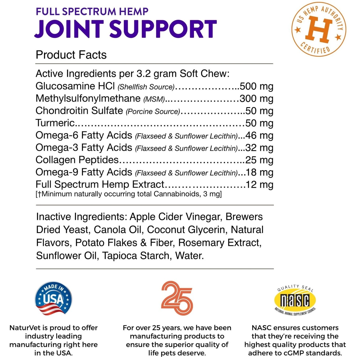 - Includes hemp, turmeric, and omega fatty acids which support joints, connective tissues, tendons, muscles, and bones.