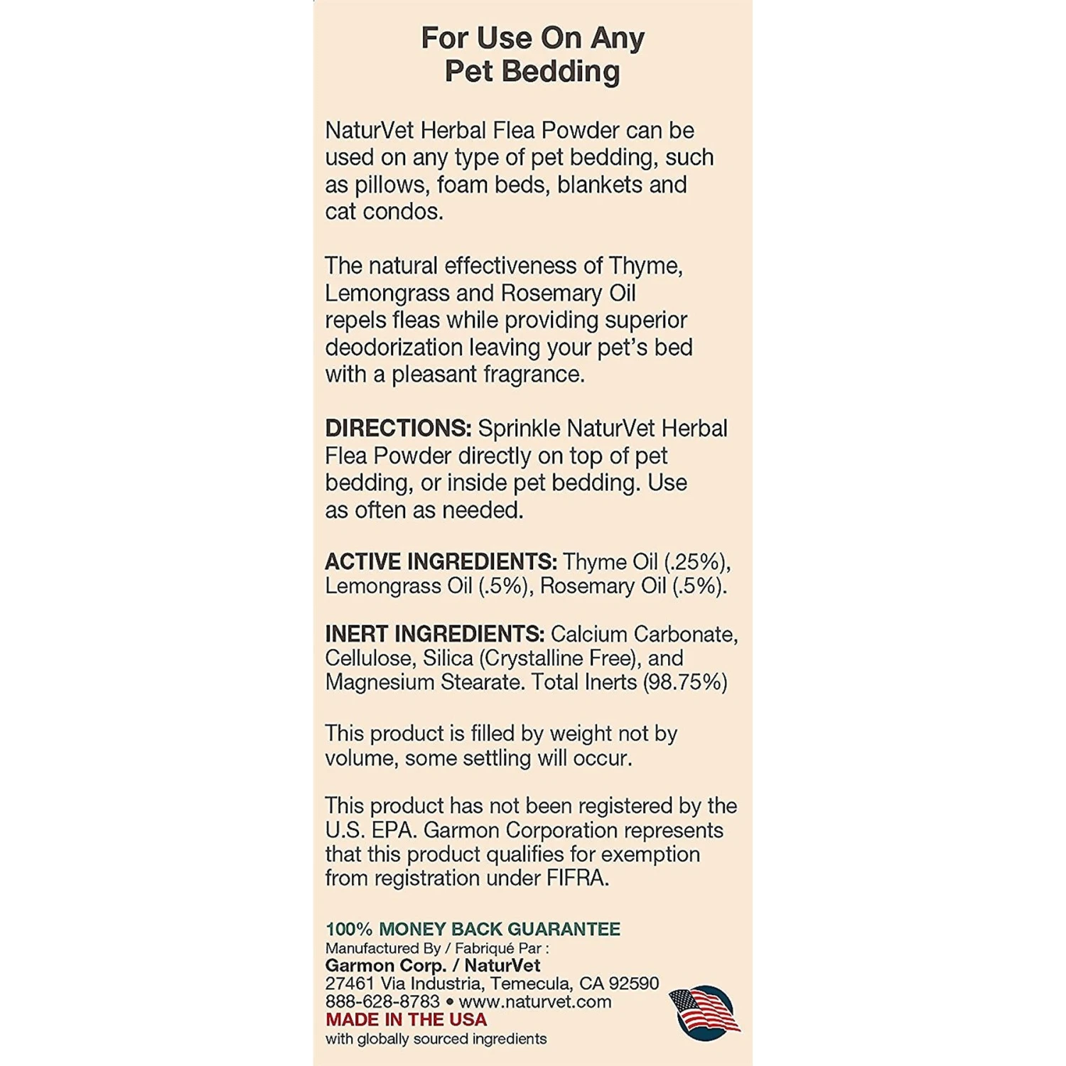 - The natural effectiveness of thyme, lemongrass and rosemary oil repels fleas while providing superior deodorization leaving your pet’s bed with a pleasant fragrance