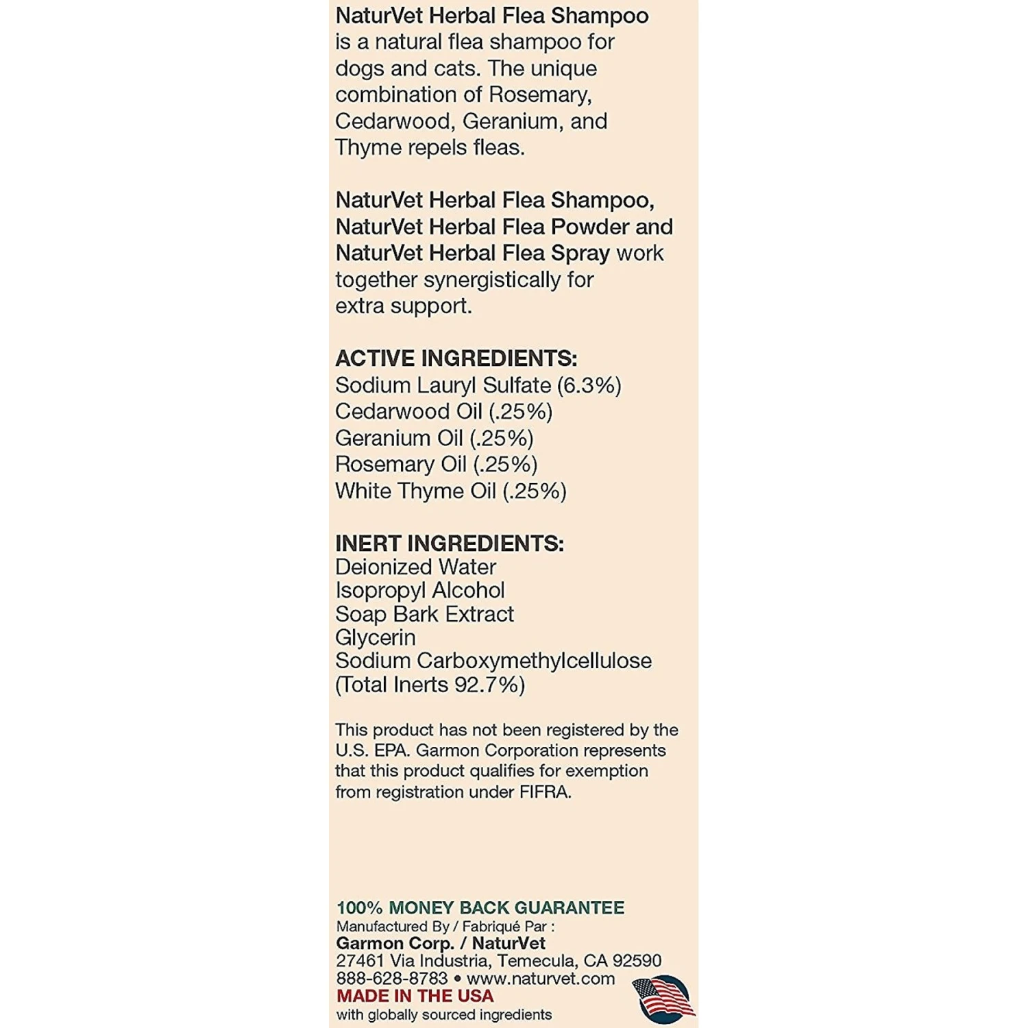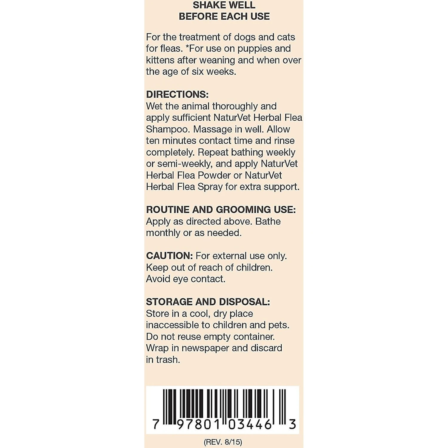 Shake well before each use. Wet the animal thoroughly and apply sufficient NaturVet Herbal Flea Shampoo. Massage in well. Allow ten minutes contact time and rinse completely. Repeat bathing weekly or semi-weekly, and apply NaturVet Herbal Flea Powder or NaturVet Herbal Flea Spray for extra support.