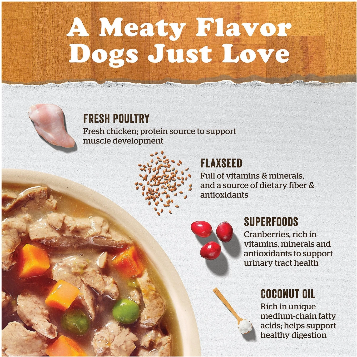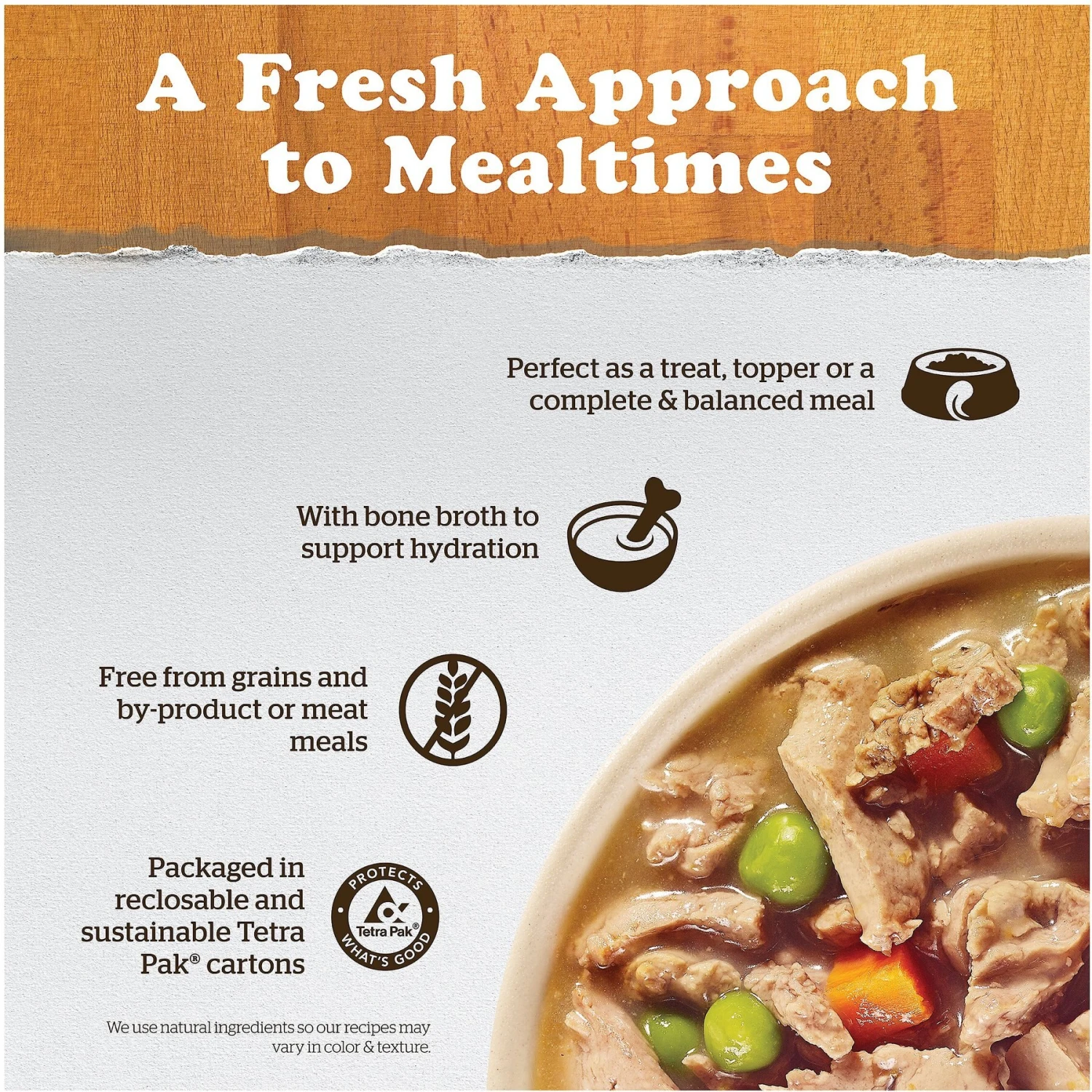 - Paw-fectly balanced nutrition for dogs of all ages, this recipe can be served as a treat, a dry dog food topper or a complete meal. It contains the essential nutrients your dog needs to thrive, plus chicken and turkey bone broth for added hydration and to tempt picky eaters.