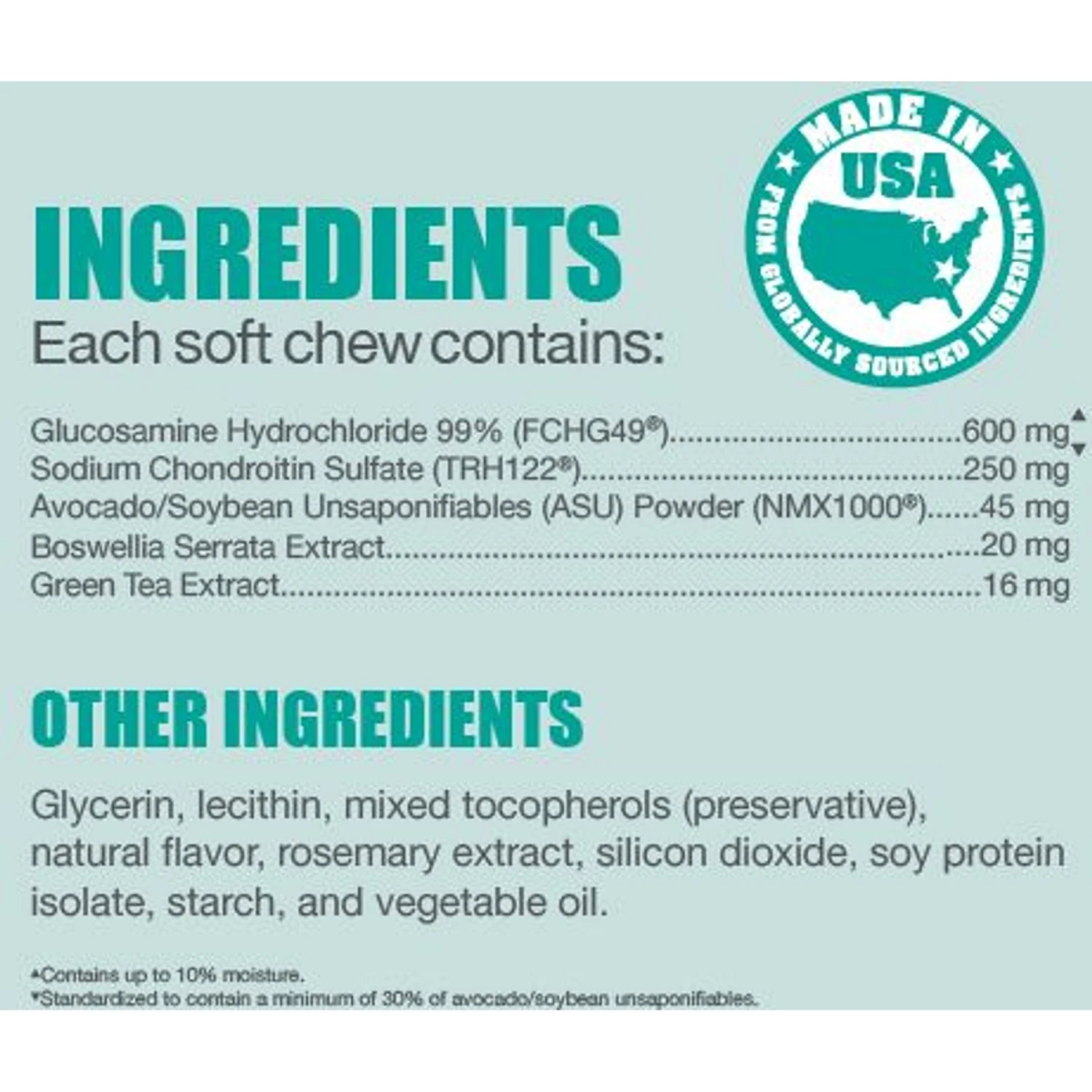 - Formulated with glucosamine, chondroitin sulfate and avocado/soybean unsaponifiables (ASU) to support your dog’s joint health.