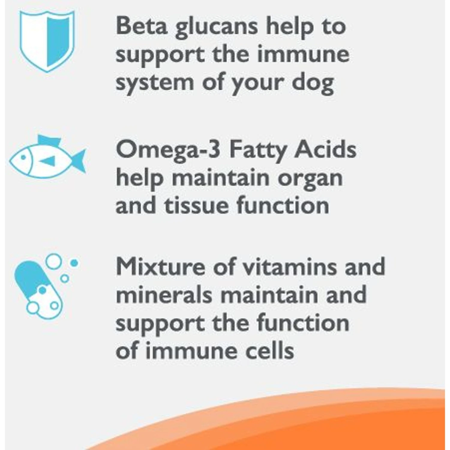 - Blend of beta glucans, omega-3 fatty acids including EPA and DHA plus a mix of vitamins and minerals help support the immune health of dogs of all ages.