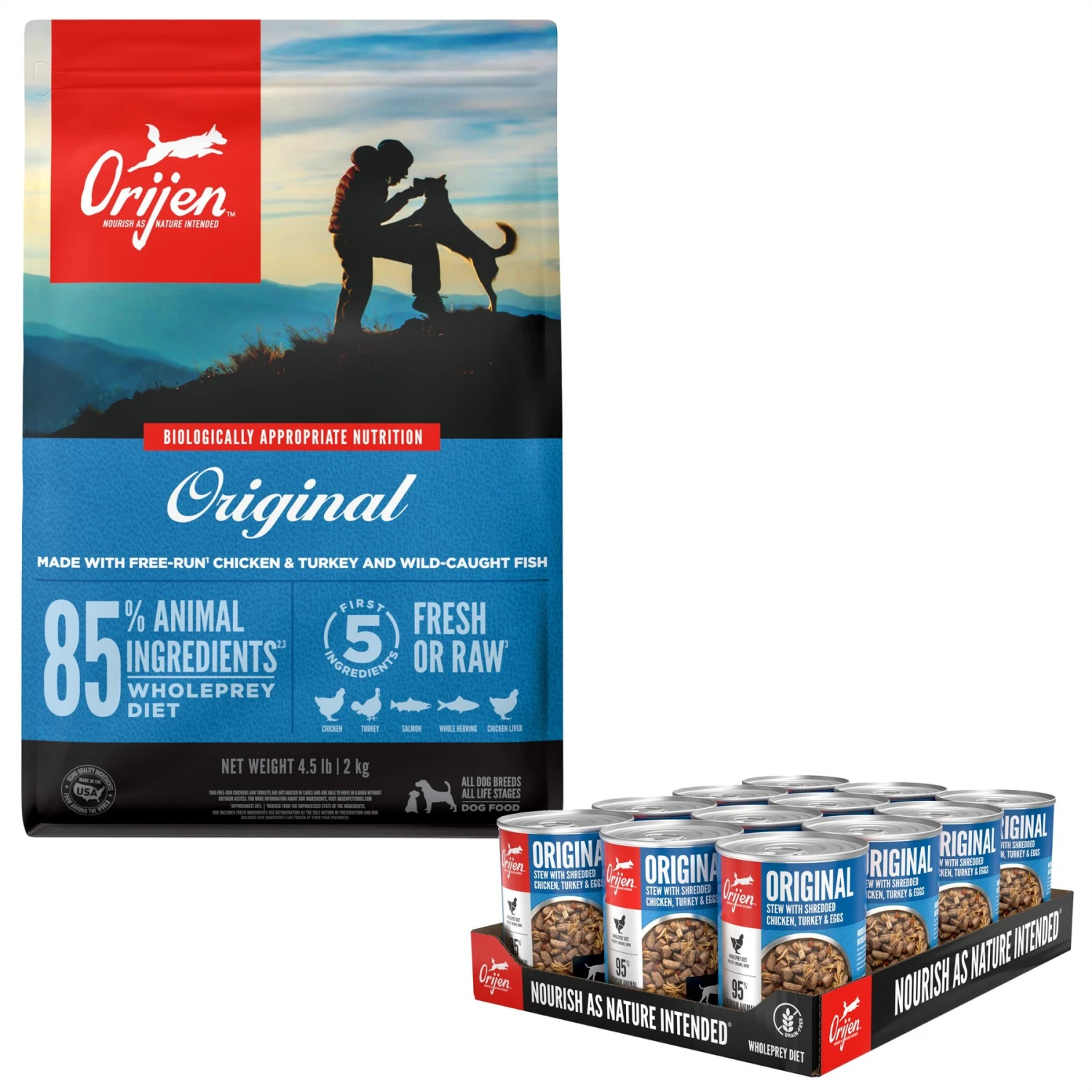 ORIJEN Real Meat Shreds Original Stew Grain-Free Wet Dog Food, 12.8-oz Can, Case Of 12 & ORIJEN Original Grain-Free Dry Dog Food