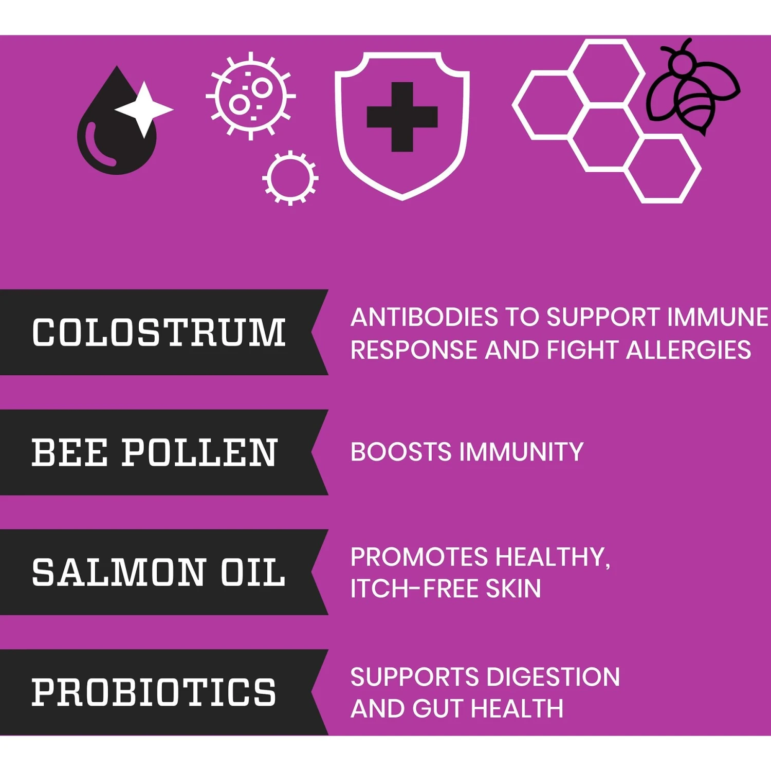 - Contains an ideal combination of colostrum, bee pollen, Alaskan salmon oil, apple cider vinegar, and probiotics.