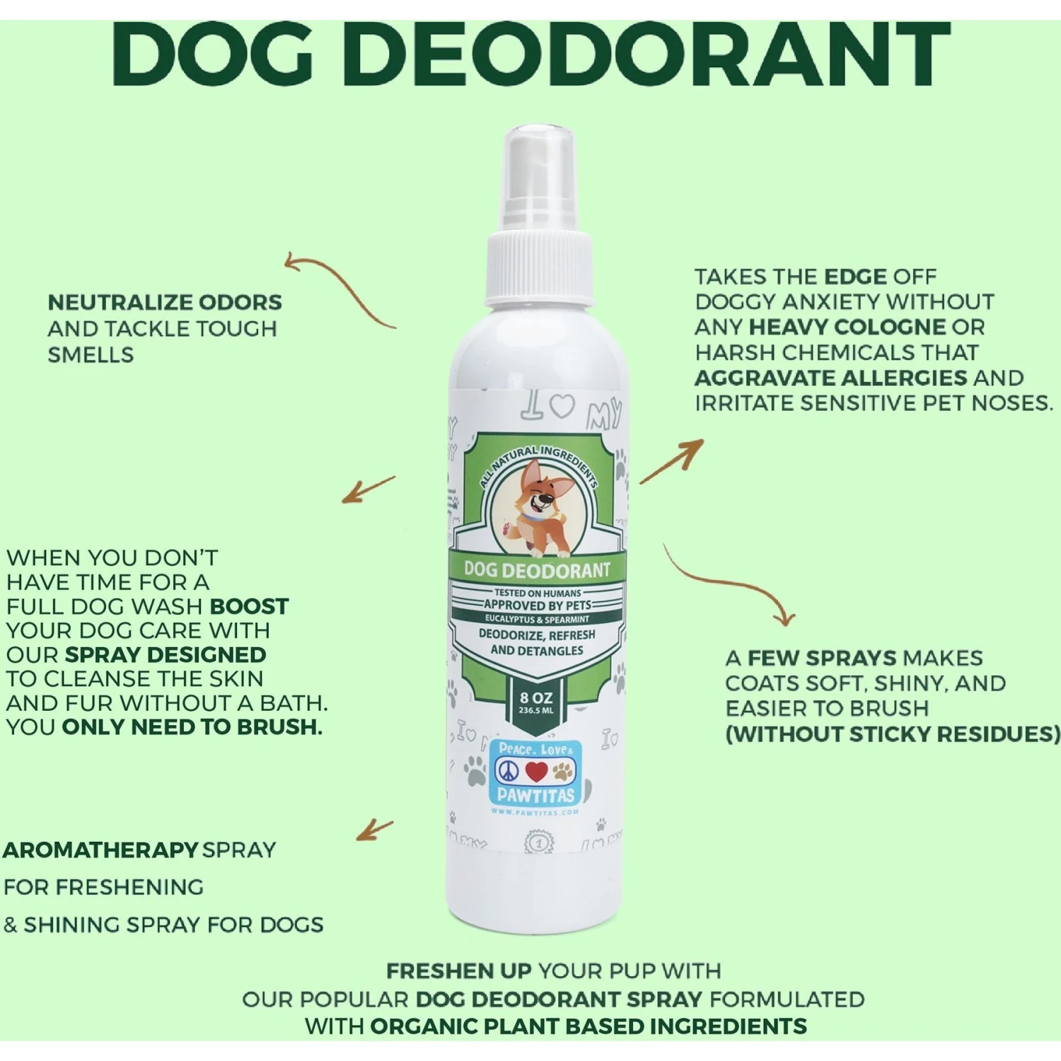 - Herbal deodorant designed to be used on your furry friend in between baths.