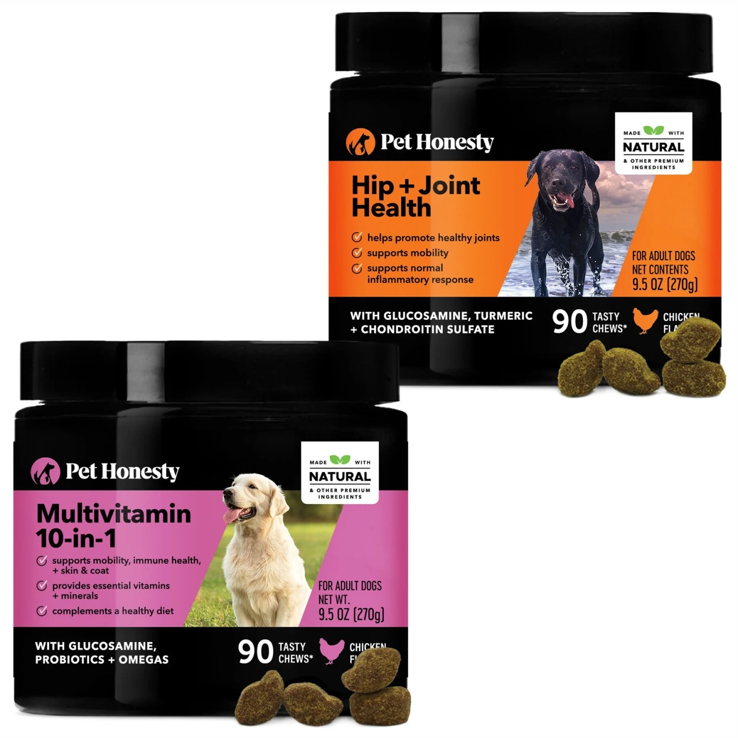 PetHonesty 10-for-1 Chicken Flavored Soft Chews Multivitamin for Dogs, 90 count—Help support your furry friend’s overall daily health with PetHonesty’s 10-for-1 Multivitamin Treats with Glucosamine, Probiotics, Omegas and more! These vet-recommended chews are made with a wag-worthy natural chicken flavor and a combination of glucosamine, vitamin C, omegas, vitamin A and other essential vitamins and minerals! These ingredients work together to support hip and joint health, heart health, and skin and coat health. They also help promote energy and offer your pup the antioxidants and probiotics he needs for normal and healthy digestion. Not only do these multivitamins help provide your pet with 10 different health benefits, but they are also completely free of GMOs, wheat, corn, soy and harsh preservatives, for a chew you can feel good about choosing for your canine companion.