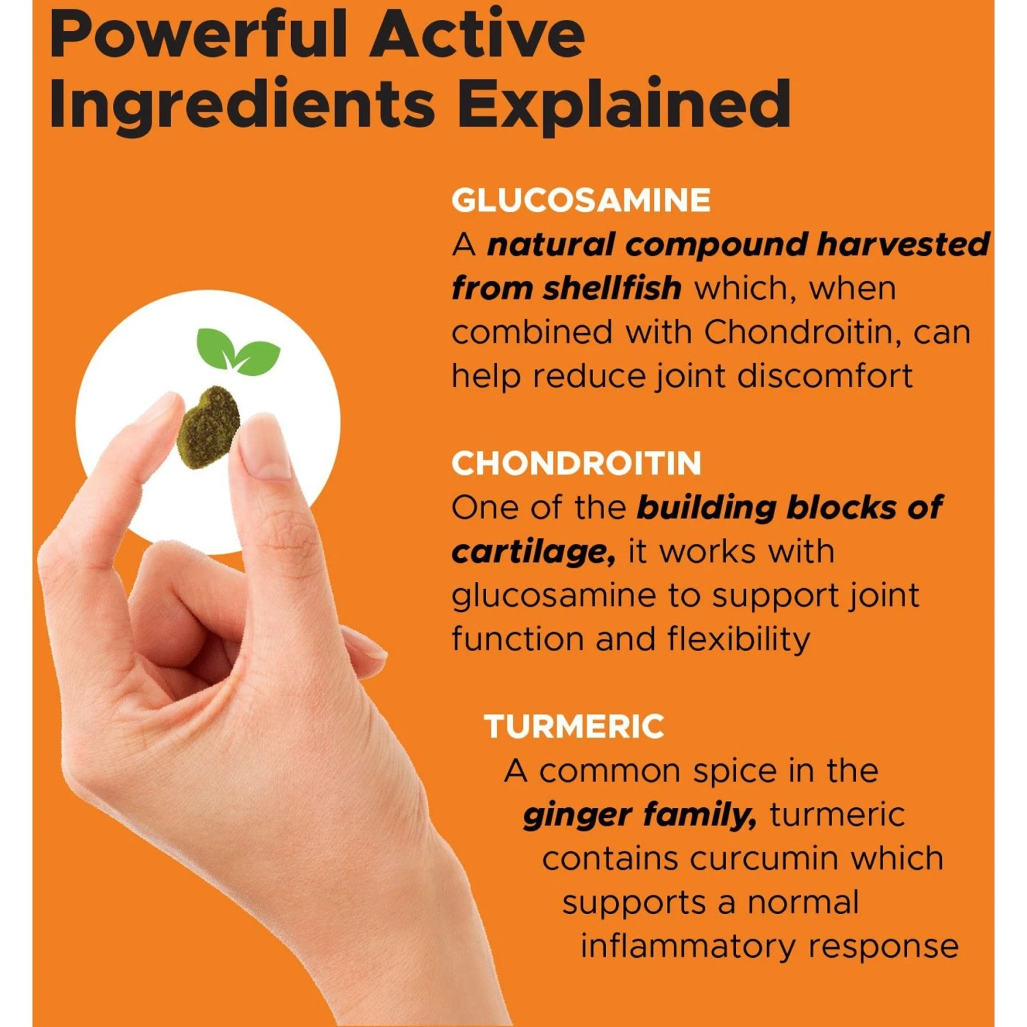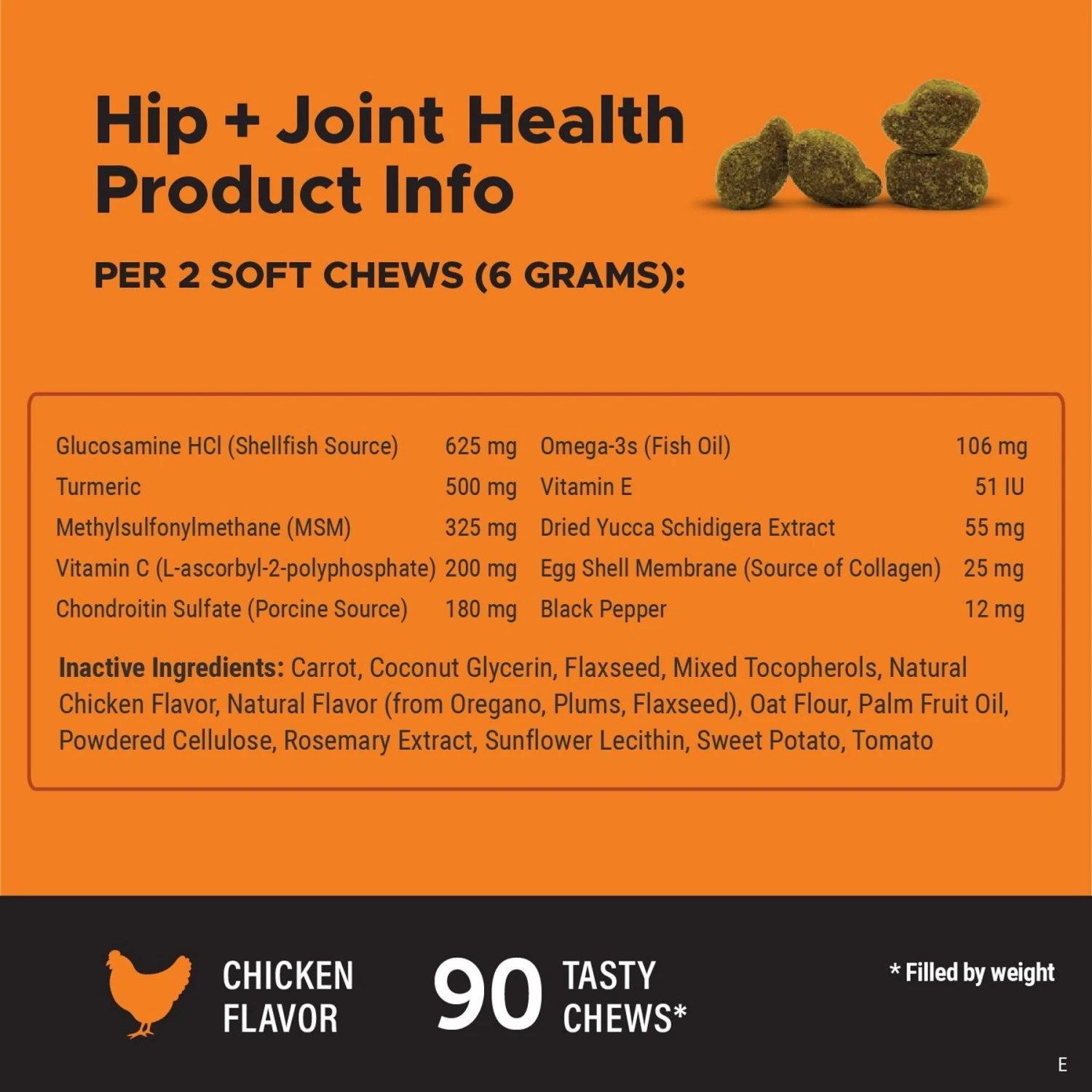 PetHonesty Advanced Hip + Joint Chicken Flavored Soft Chews Joint Supplement for Dogs, 90 count—Help support your furry friend’s hip and joint health with PetHonesty’s Advanced Hip + Joint Support Soft Chews Dog Supplement with Glucosamine and MSM. These soft chews are made with a wag-worthy natural chicken flavor and a combination of ingredients like egg shell meal (collagen), organic turmeric, yucca schidigera, glucosamine, methylsulfonylmethane (MSM) and chondroitin sulfate. Together, these ingredients work to offer antioxidant and anti-inflammatory properties to help ease joint stiffness associated with daily activity, support a healthy inflammatory response and support cartilage and connective tissue development in your dog. Not only do these chews help support your pup’s physical health with a delicious flavor and tempting texture, but they are also completely free of GMOS, wheat, corn, soy and harshpreservatives, for a chew you can feel good about choosing for your canine companion.