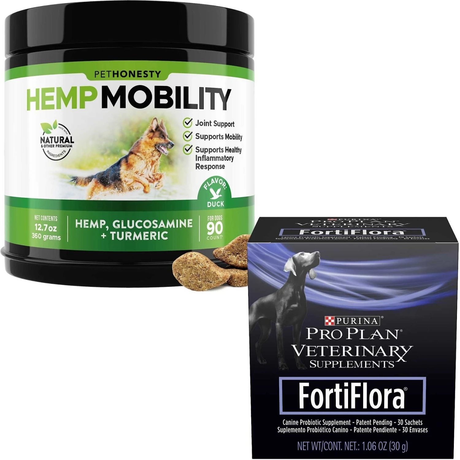 PetHonesty Hemp Hip + Joint Health Duck Flavored Soft Chews Joint Supplement For Dogs & Purina Pro Plan Veterinary Diets FortiFlora Powder Digestive Supplement For Dogs