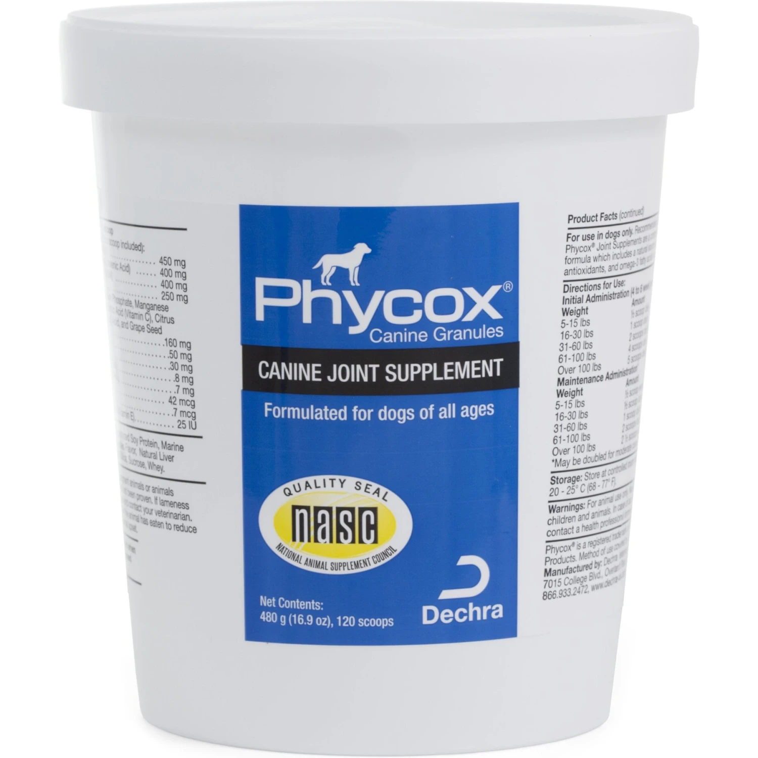 - Phycox Canine Granules contain omega-3 fatty acids, glucosamine, MSM and potent anti-oxidants such as ascorbic acid (vitamin C), selenium and grape seed extract