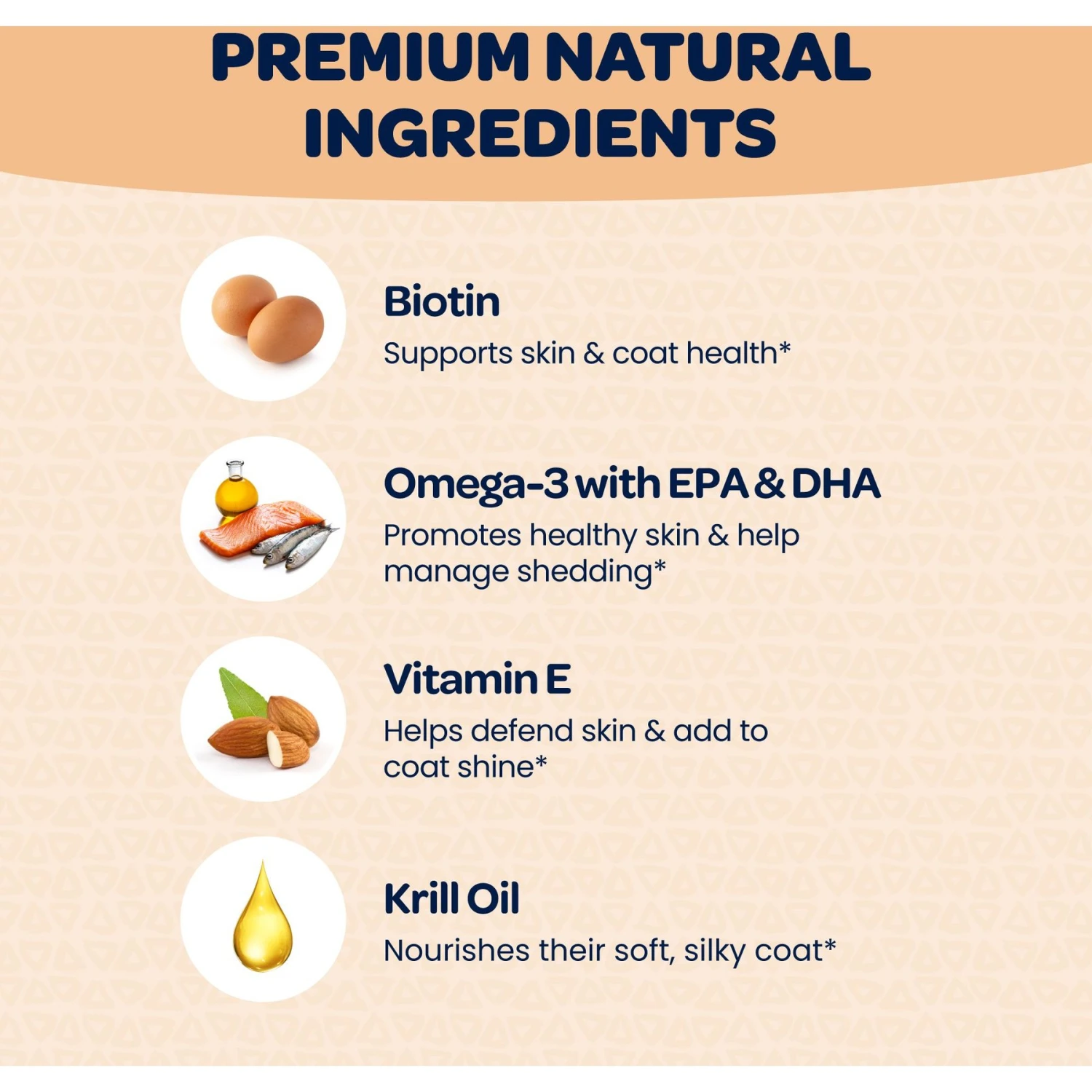 - Contains a soothing blend of omega 3, 6, 9, EPA, DHA, vitamin E, zinc, biotin, fish, krill, and flaxseed oil.