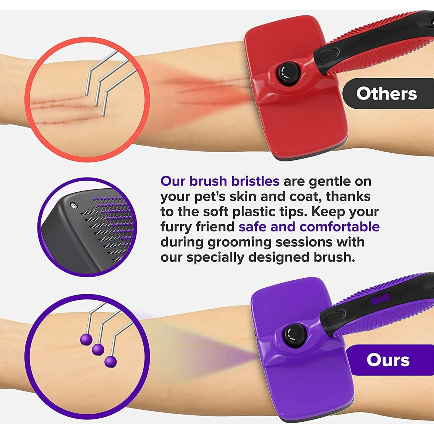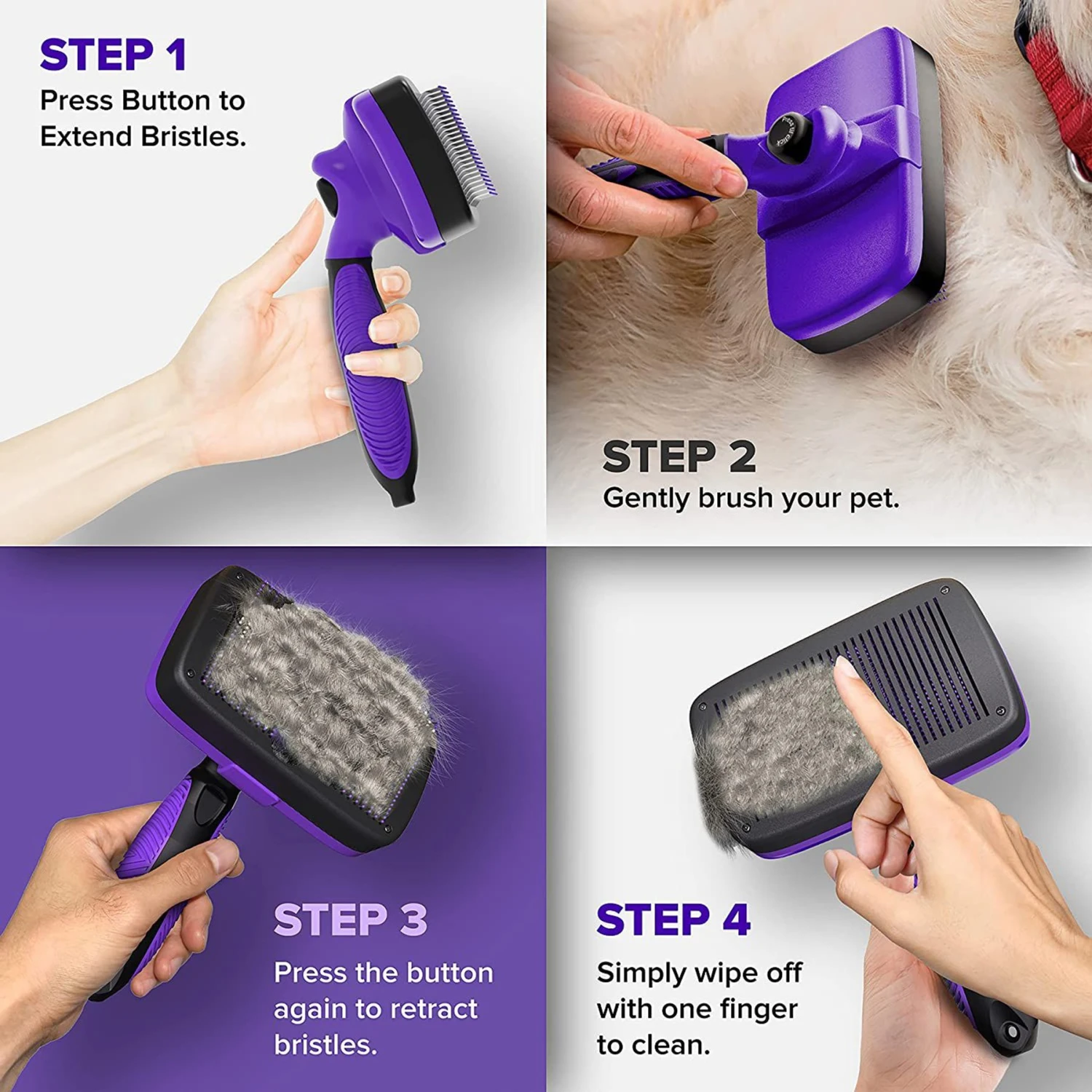 - The self-cleaning slicker brush easily removes knots, dander and loose hair from your paw-tner’s fur.
