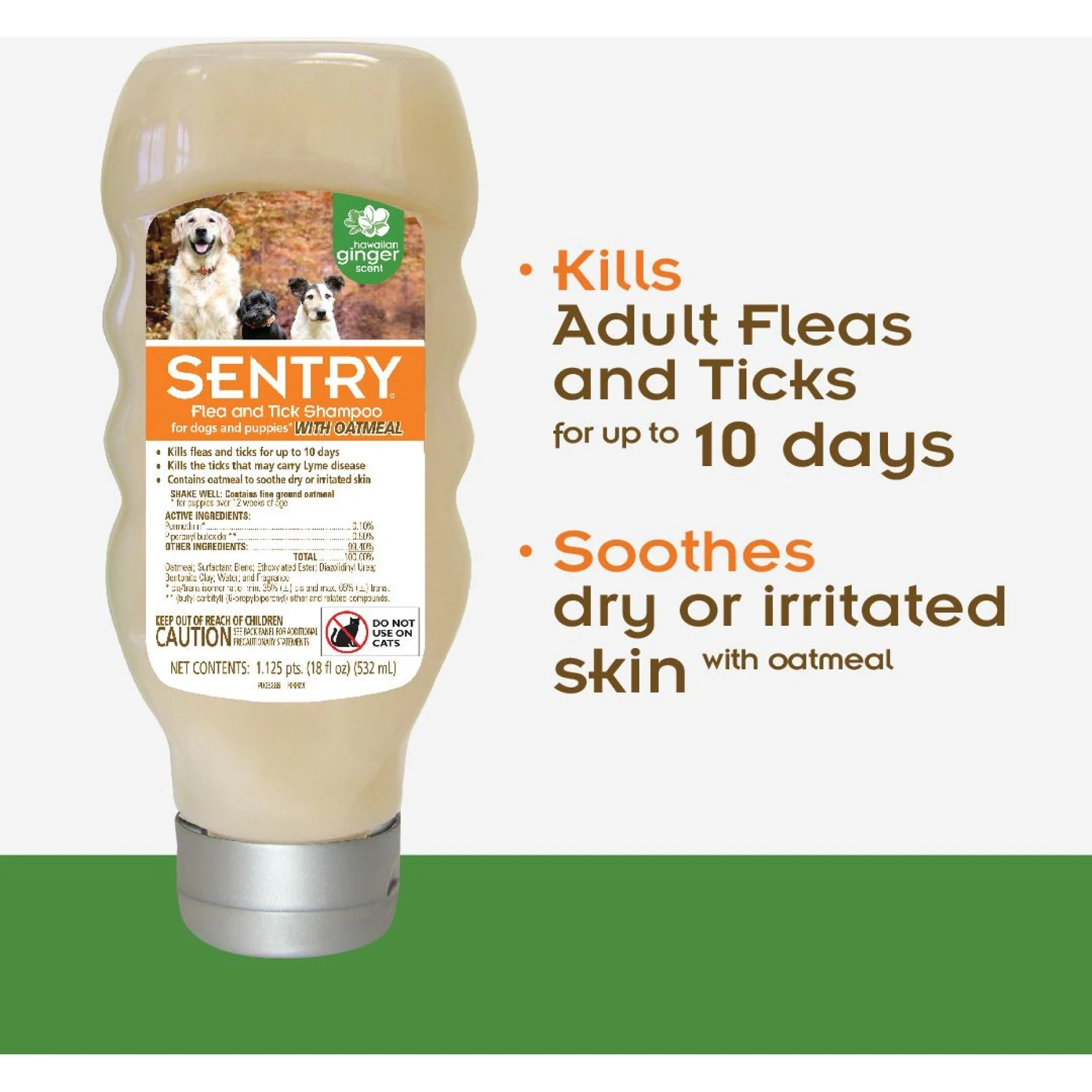 Wet dog’s coat thoroughly. Pour Sentry Flea & Tick Shampoo for dogs and puppies with oatmeal into the cup of your hand. Starting at the head and working back, work up a lather with this quick lathering formula, being sure that the lather is worked thoroughly into the dog’s coat down to the skin. Allow lather to stand five minutes, then rinse completely and towel dry. It should not be necessary to repeat the shampoo application unless the animal is excessively dirty. Kills fleas fast and begins to kill ticks within 1 to 2 days; reaching maximum effectiveness in 7 to 10 days. To maintain maximum effectiveness against both flea and ticks, repeat every week. Cats that actively groom or engage in close physical contact with treated dog may be at risk of serious harmful effect.
