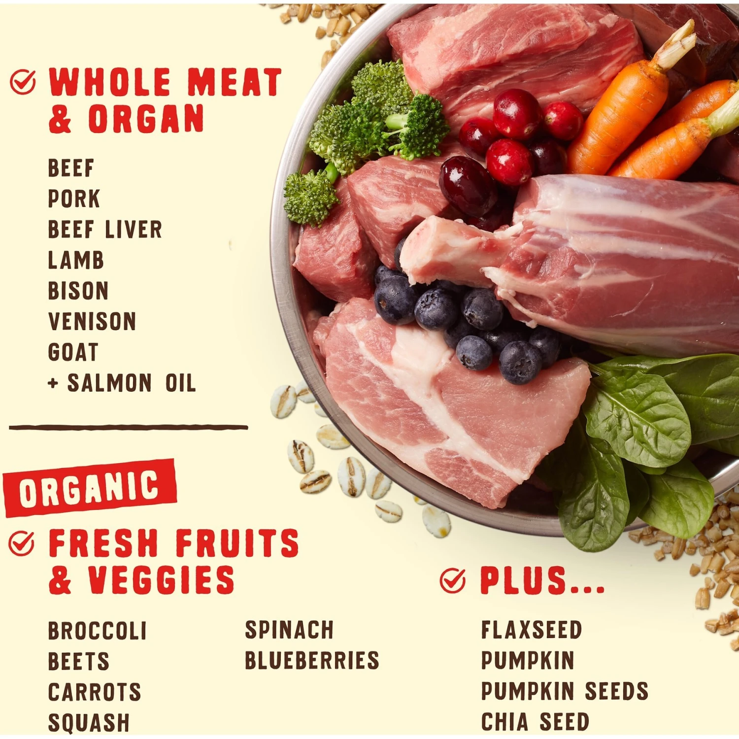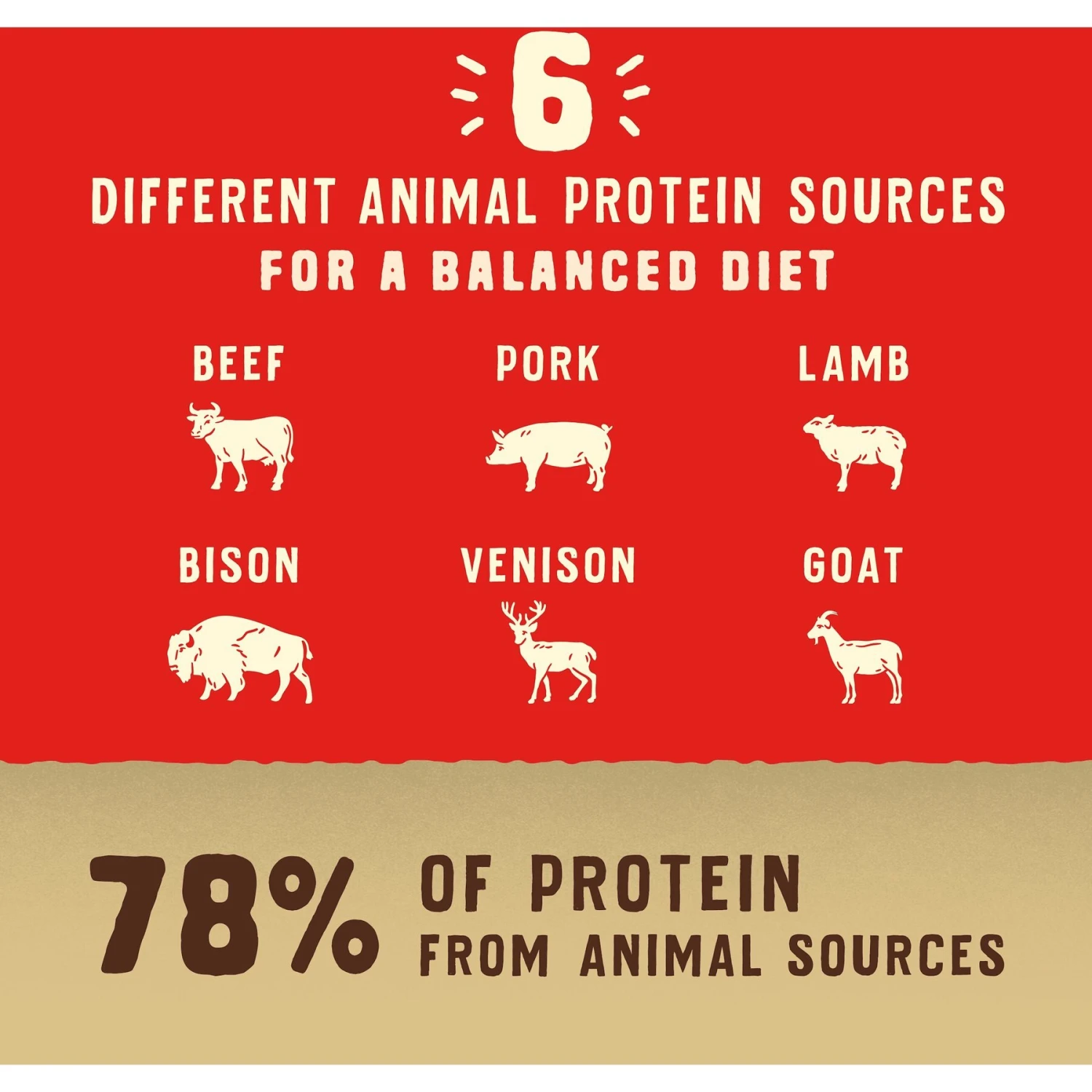 - Packed full of protein with beef, pork, lamb, bison, venison, and goat.