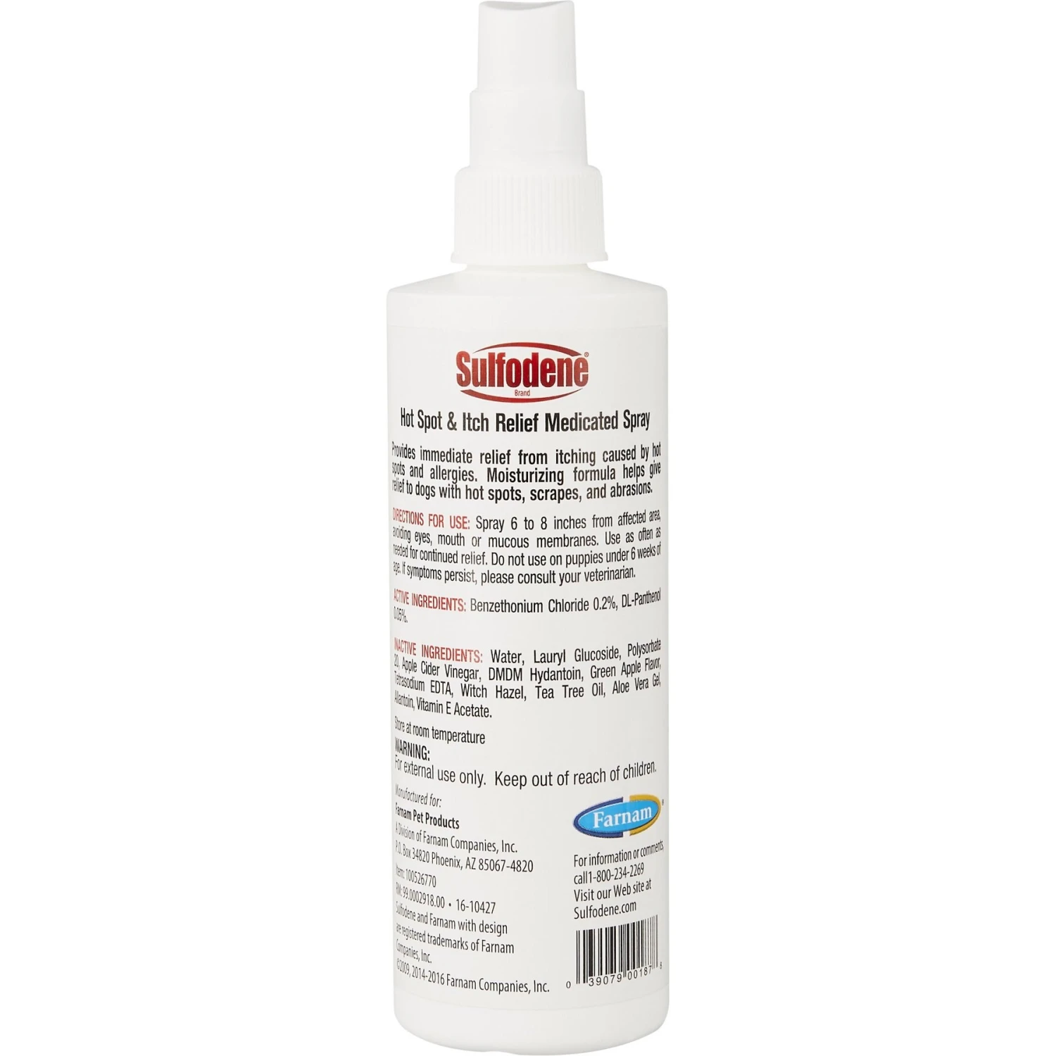 - Medicated spray treats itchy hot spots, insect bites and irritated wounds.