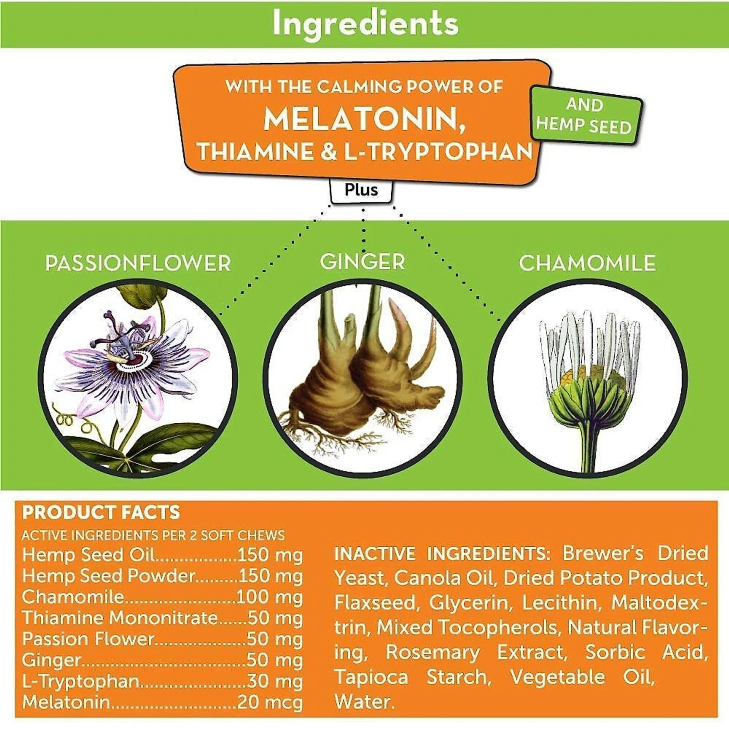 - Unique combination of hemp seed oil, Thiamine and L-tryptophan helps reduce stress and tension in dogs.