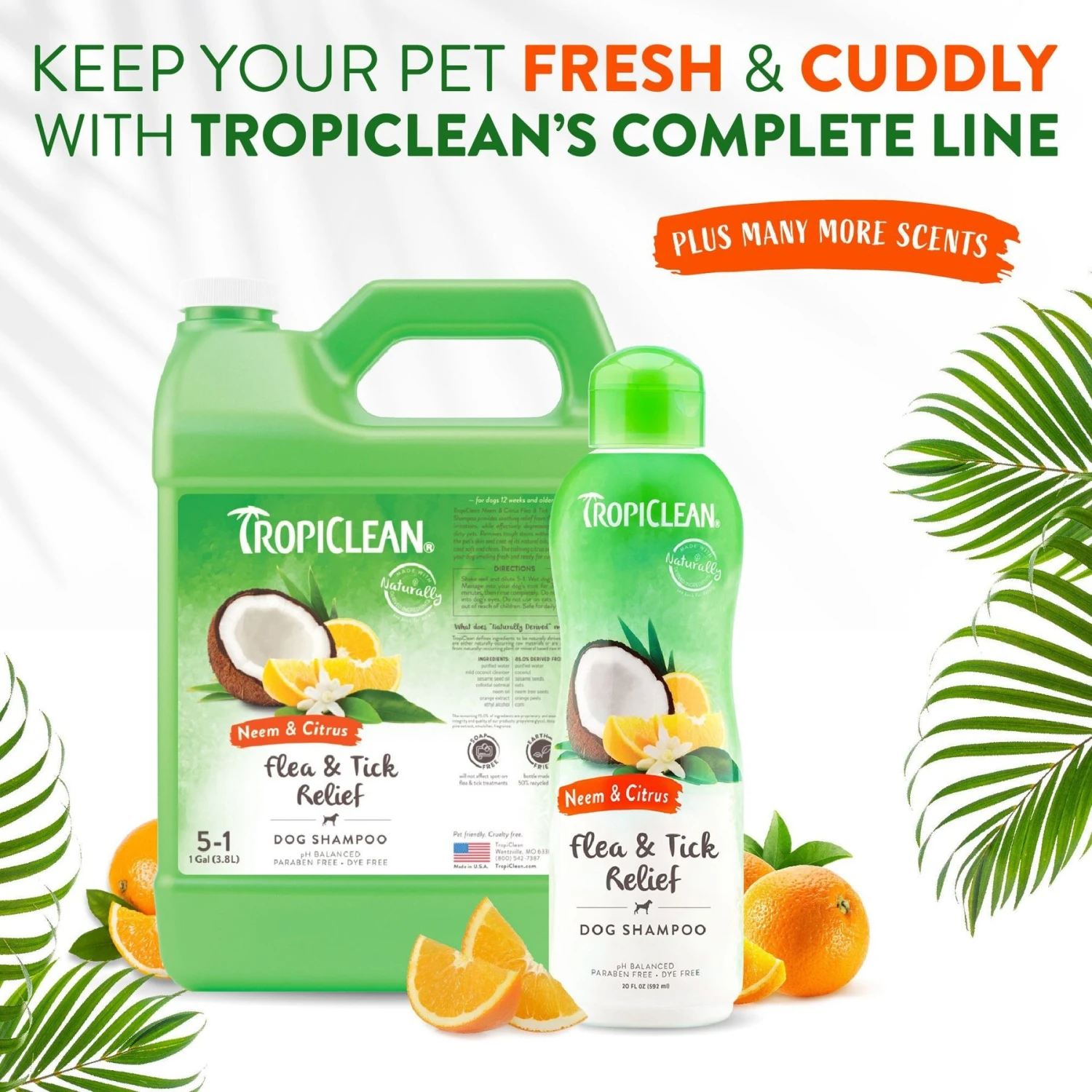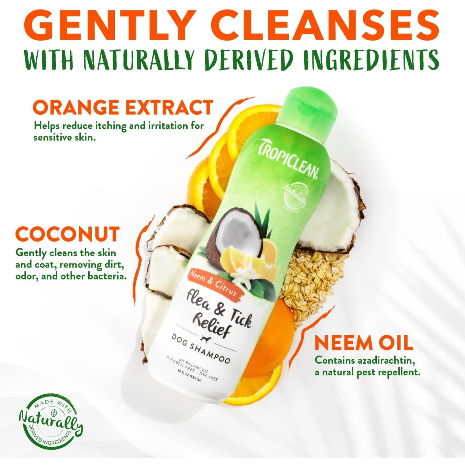 - For a tropical experience, pair this shampoo with TropiClean’s other flea and tick products like the bite relief spray or the dog and bedding spray (each sold separately).