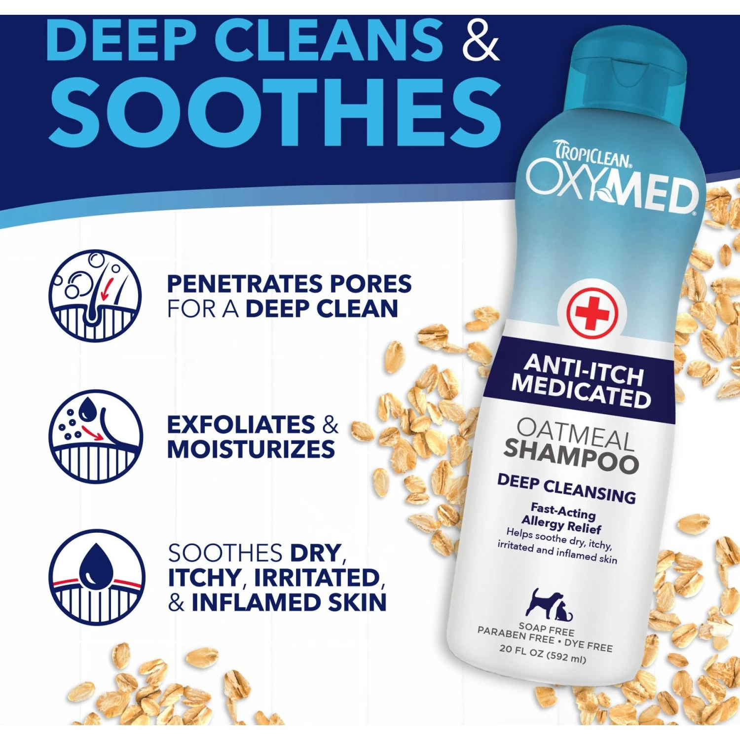 - TropiClean OxyMed Medicated Anti-Itch Oatmeal Dog & Cat Shampoo, 20-oz bottle—Medicated oatmeal shampoo for dogs offers relief for dry, flaky, and irritated skin.