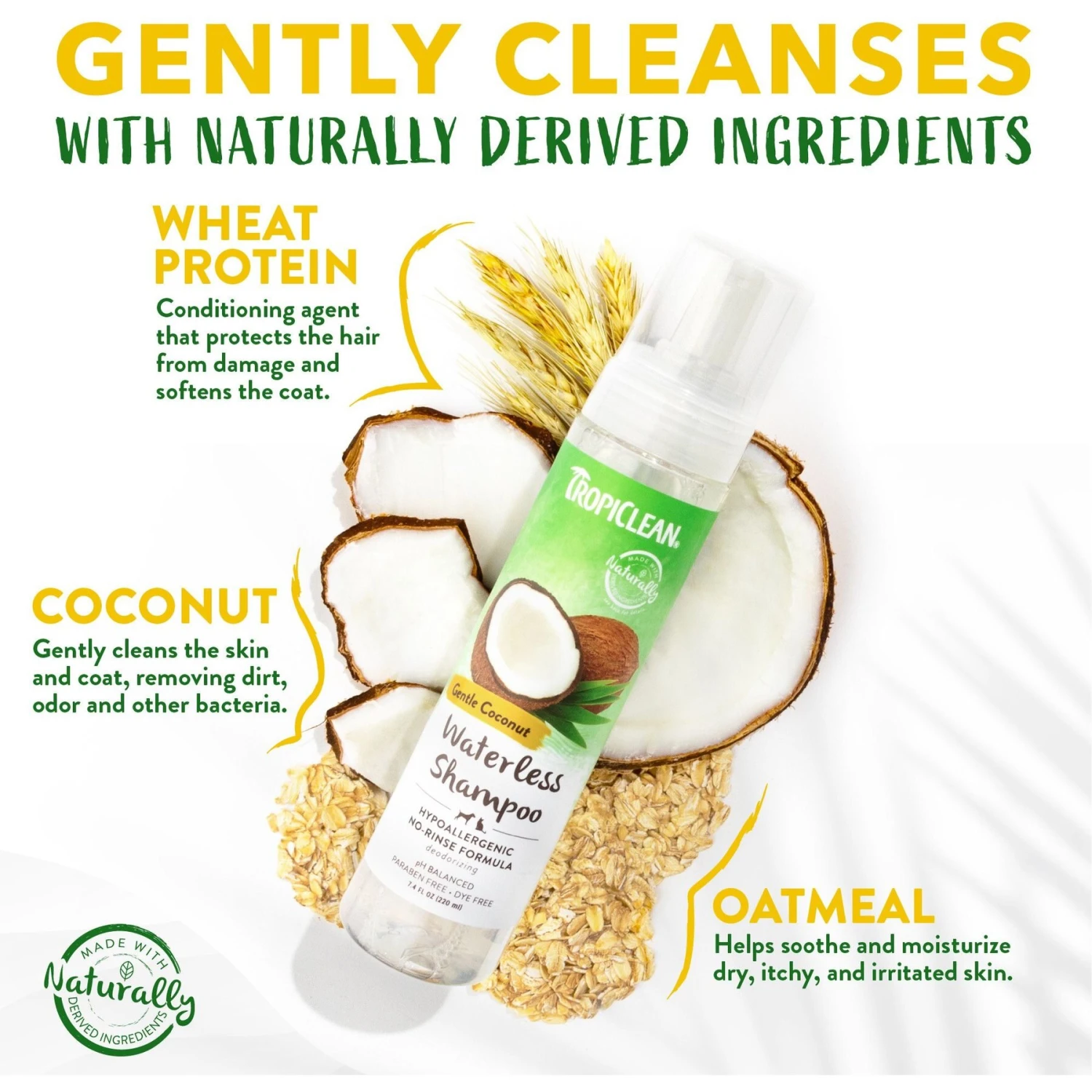 - This waterless coconut dog shampoo is derived from natural ingredients such as moisturizing coconut and oatmeal for a silky soft coat.