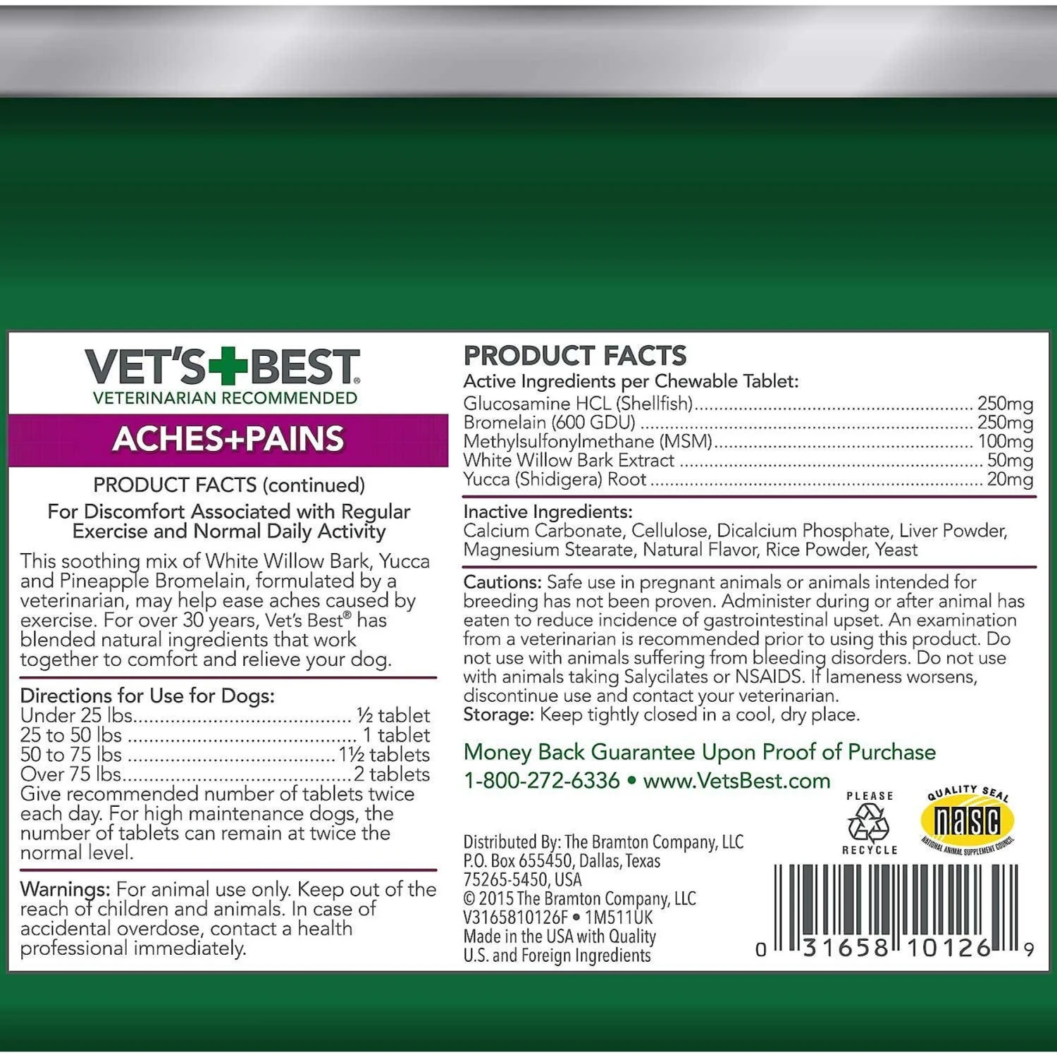 - Vet’s Best Aches + Pains Dog Supplement helps relieve occasional discomfort caused by regular exercise and normal daily activity.