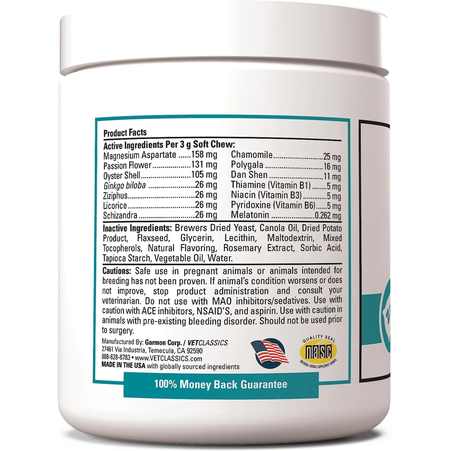 - Magnesium, Passion Flower, Oyster Shell, Gingko Biloba, Chamomile, and Melatonin help to support calming behavior by promoting rest and relaxation.