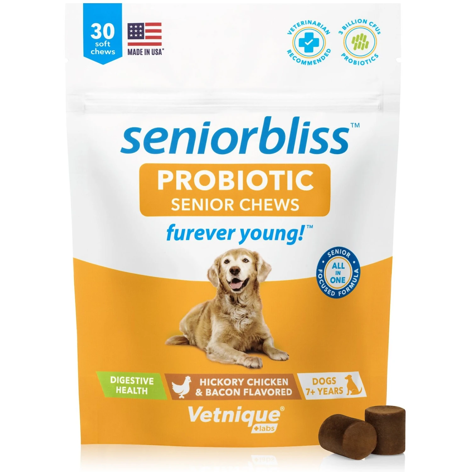 Vetnique Labs Seniorbliss Dog Probiotic Supplement Hickory Chicken & Bacon Soft Chews Digestive Supplement For Senior Dogs